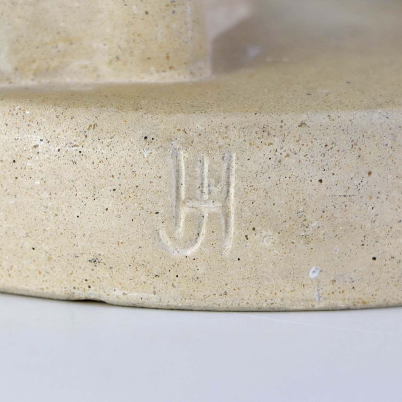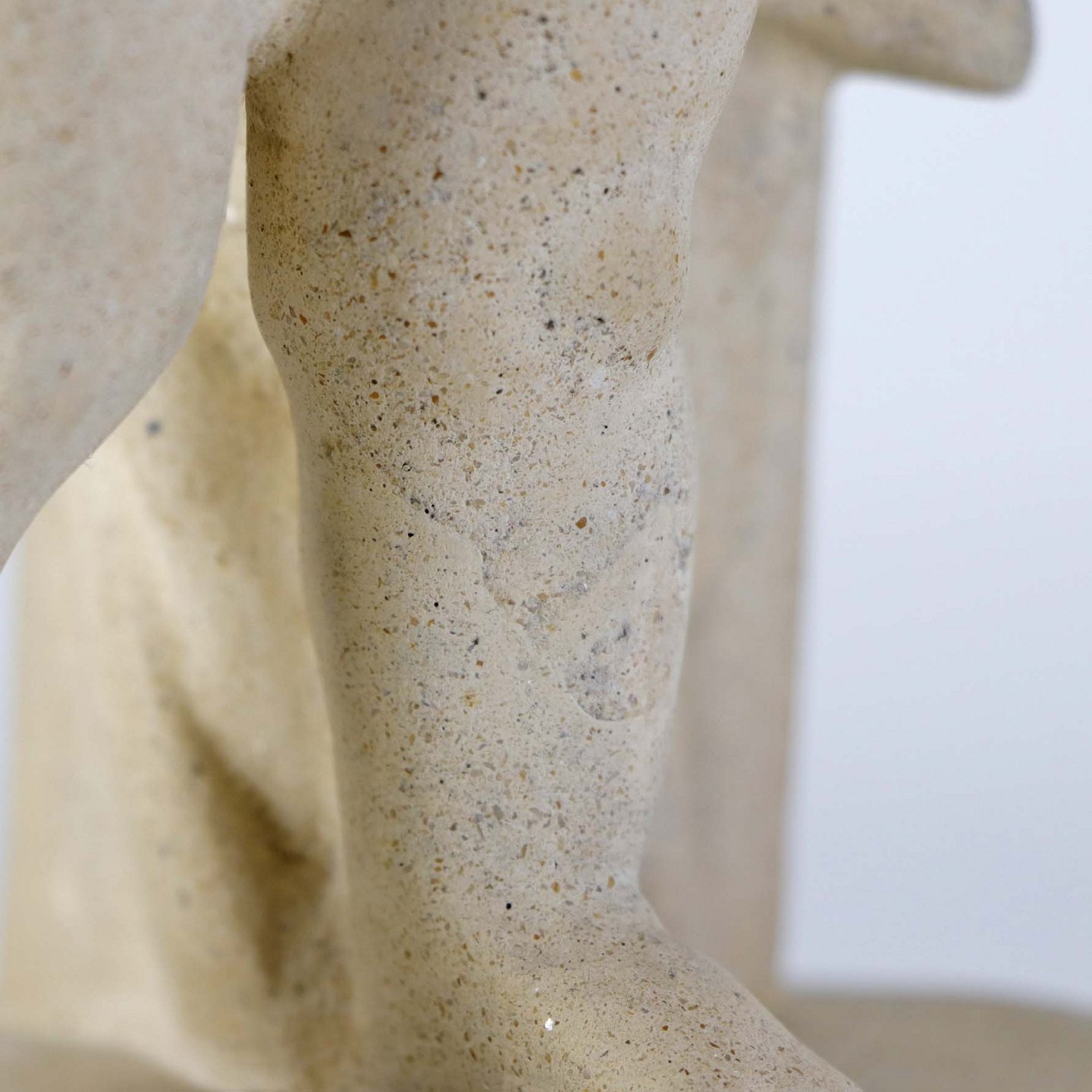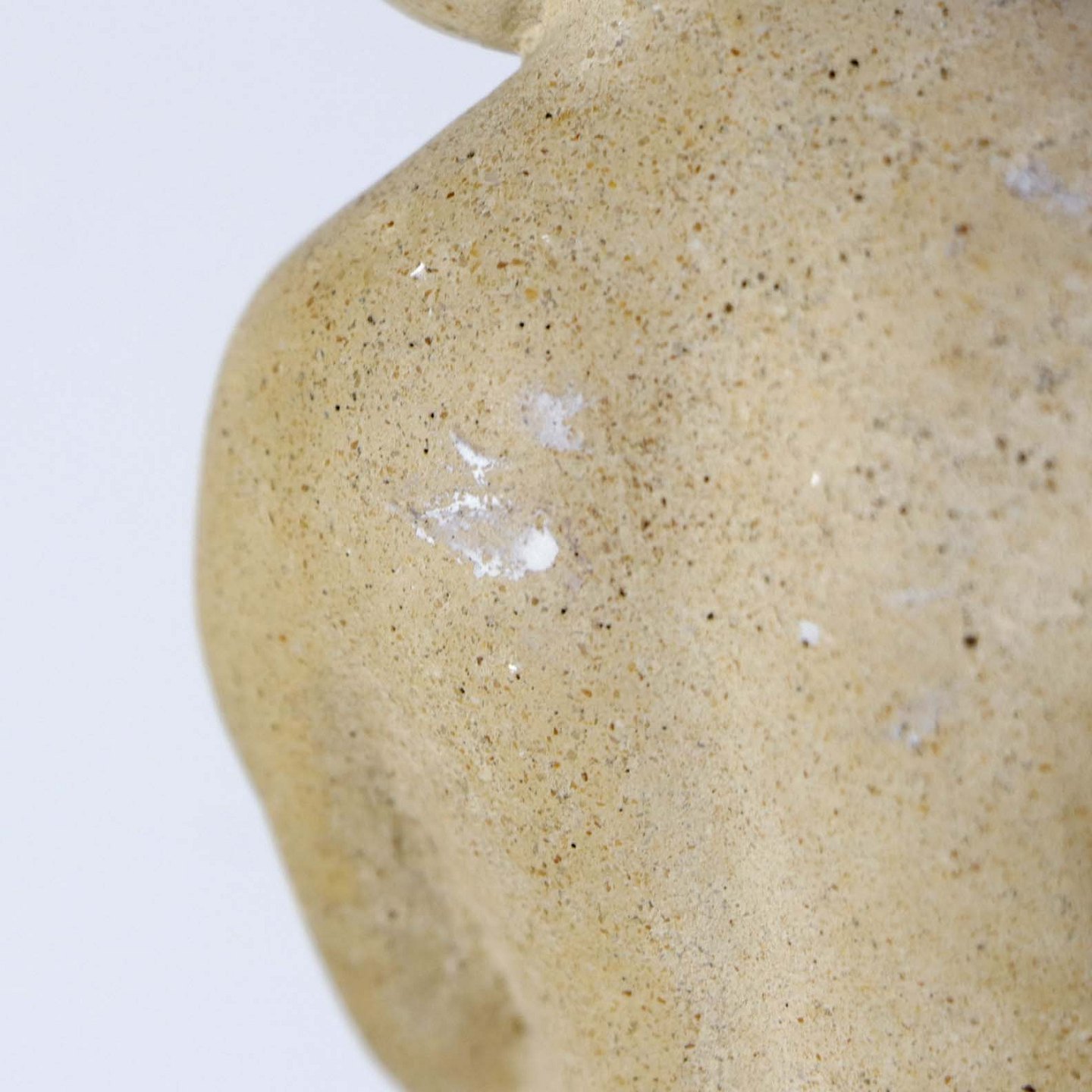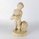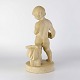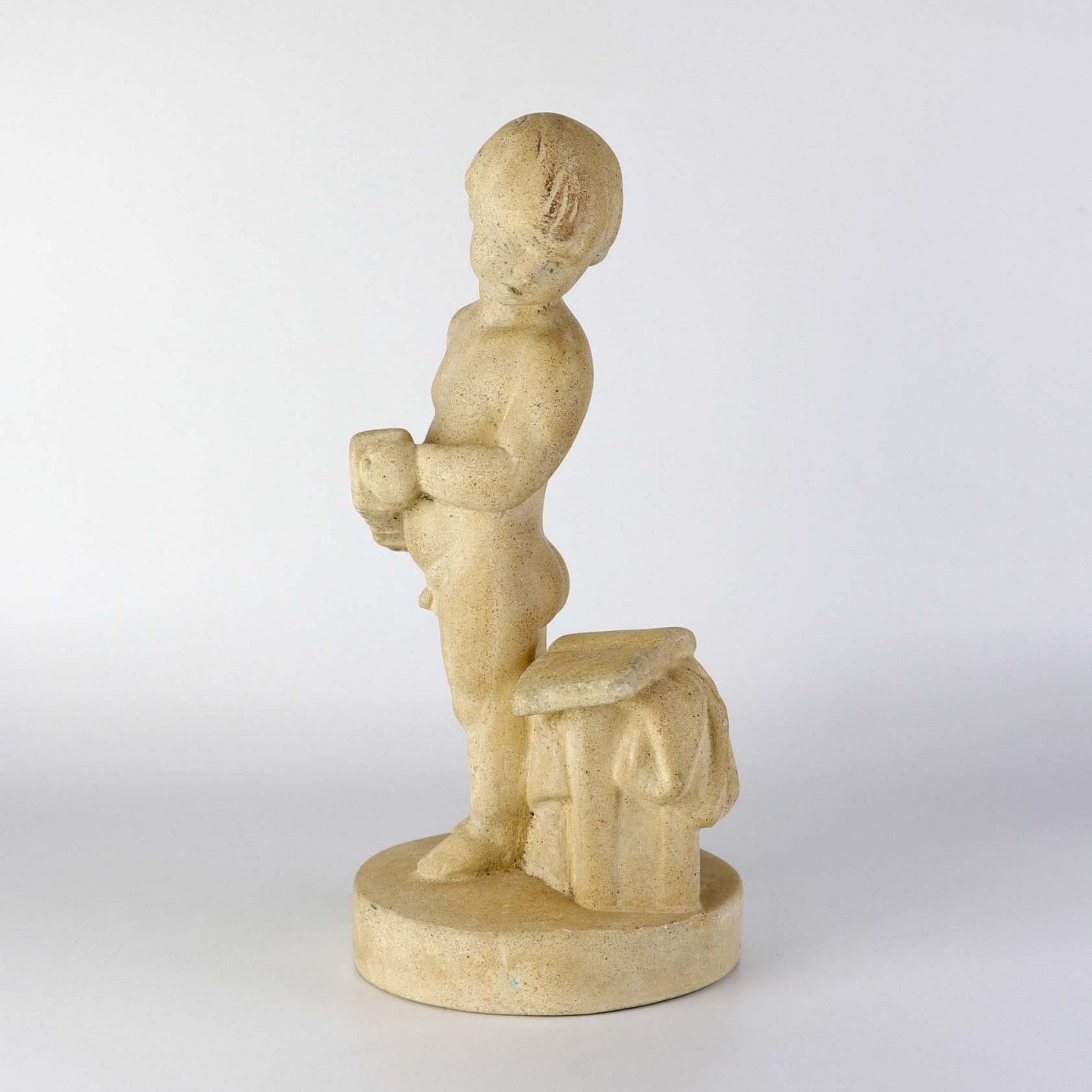 Figur i sandsten med motiv af dreng som spiller harmonika.