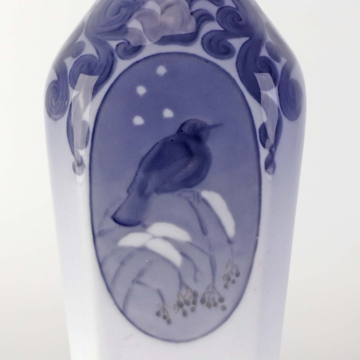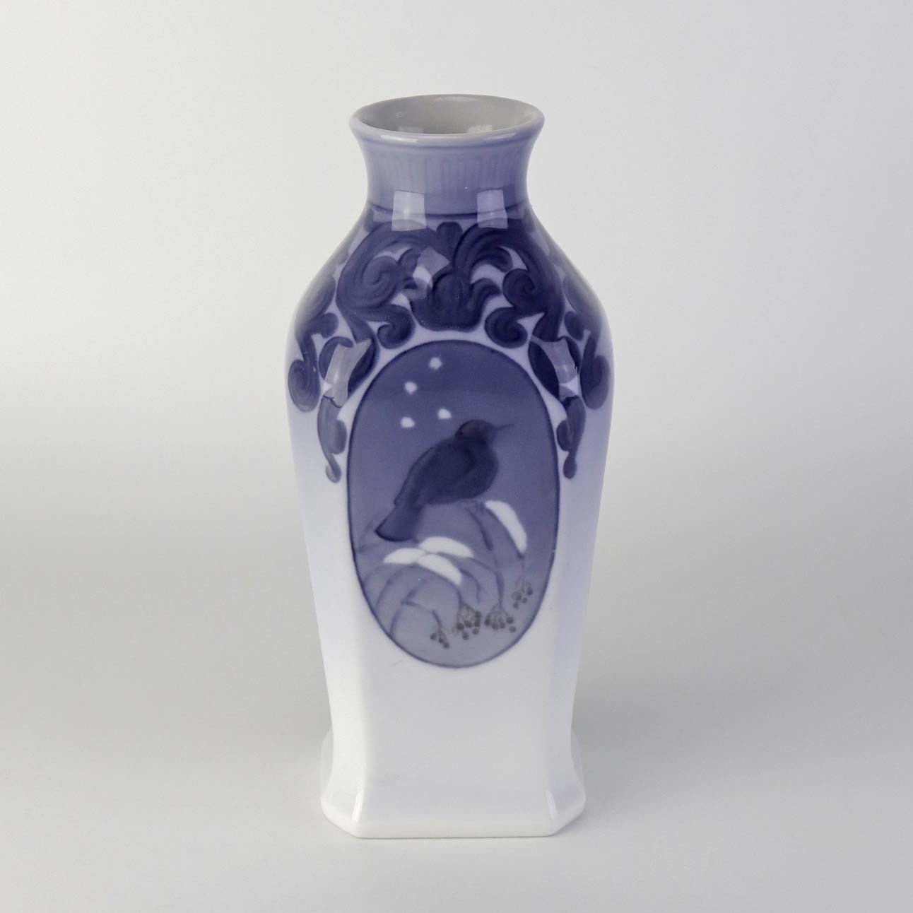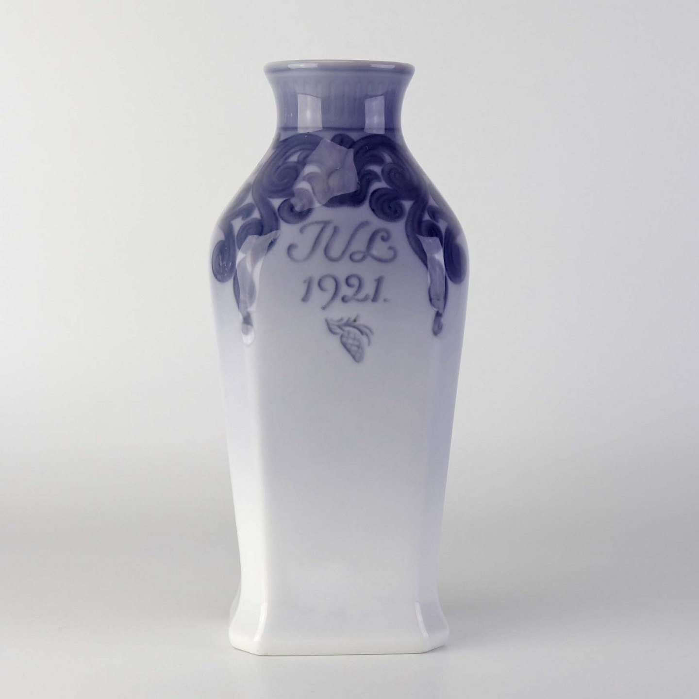 Kantet julevase i kongeligt porcelæn med motiv af af solsort på gren og teksten Jul 1921. Nr. 199