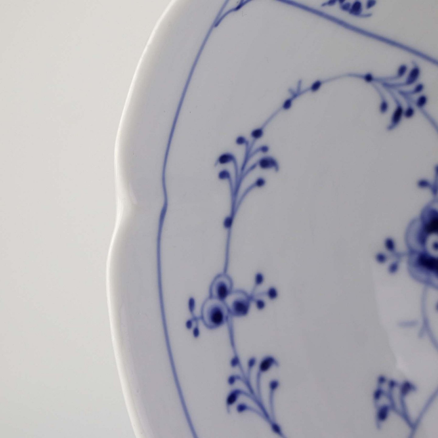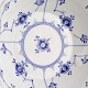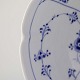Musselmalet halvblonde er riflet hvidt porcelæn med dekoration af blå ranker og en kant med blonder.