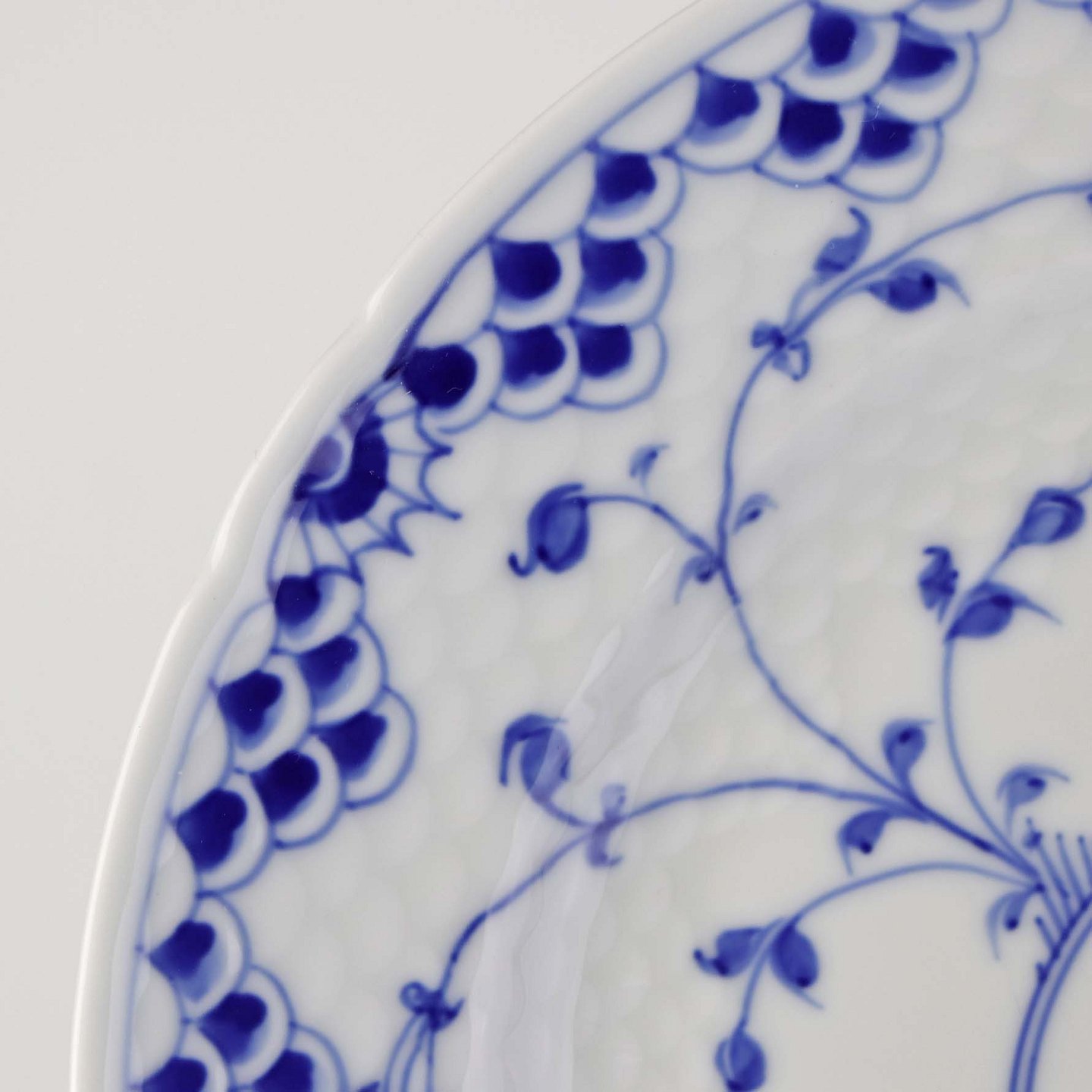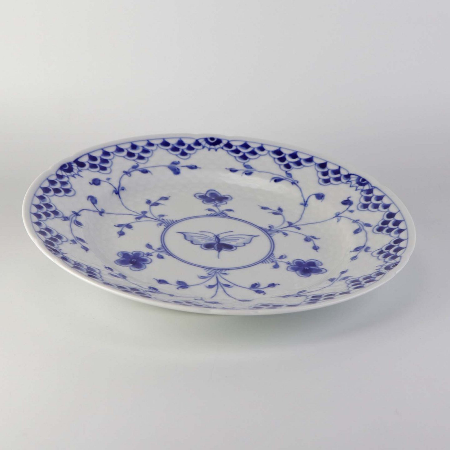 Tallerken i hvidt porcelæn med skelform dekoreret med blå motiver af ranker, blomster og sommerfugle.