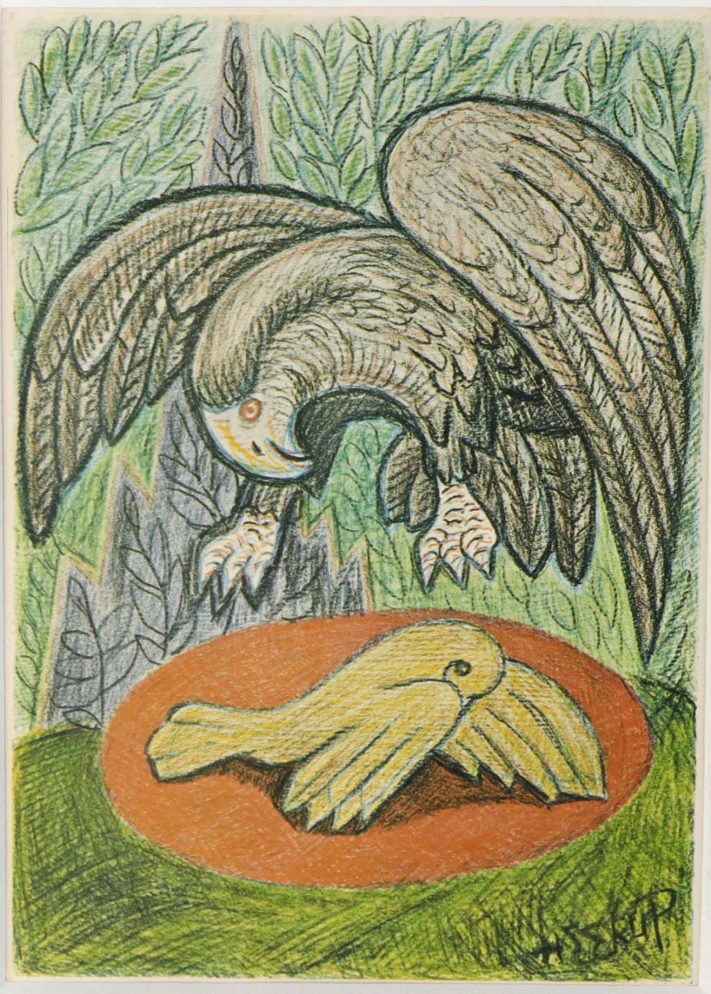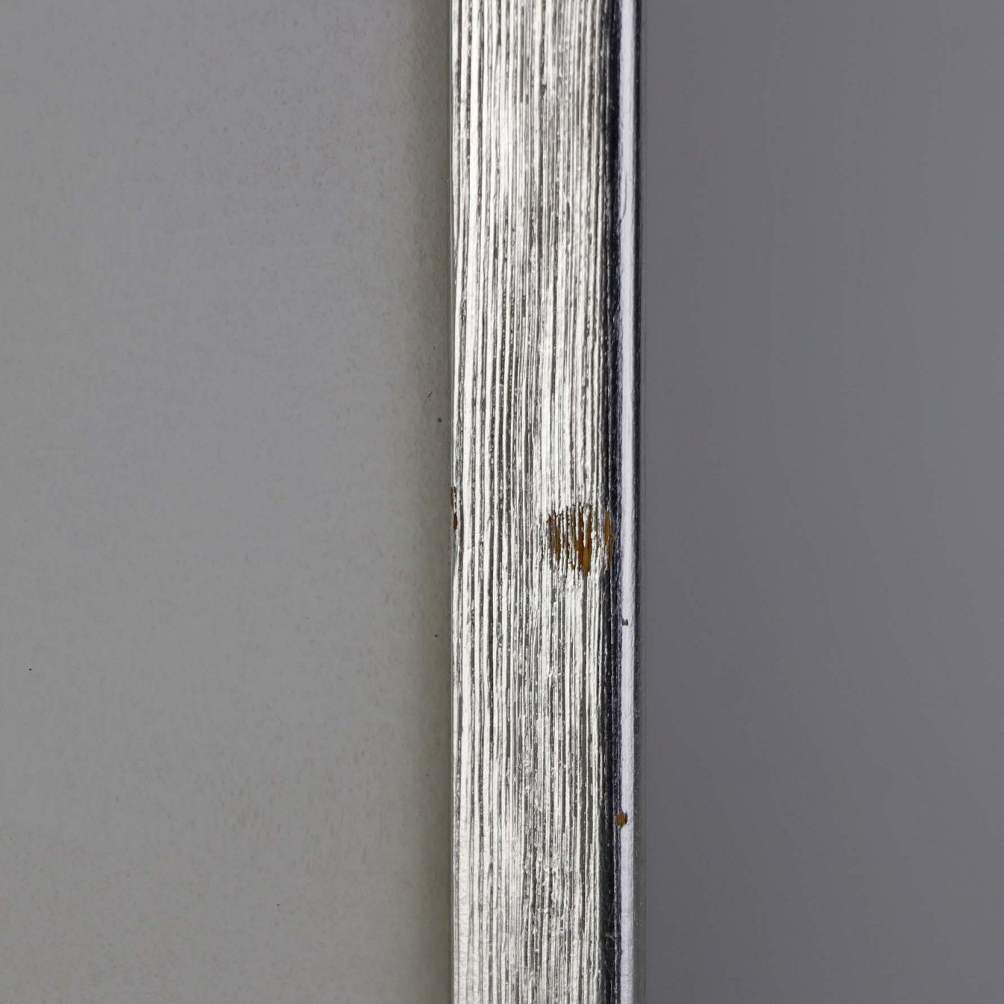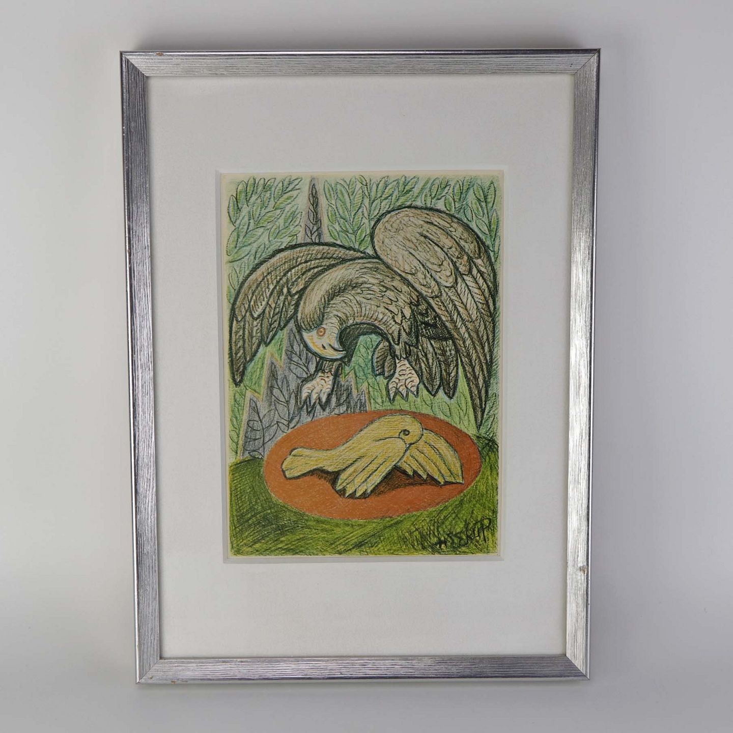 Indrammet tryk i passepartout med sølvmalet træramme og motiv af en flyvende ørn og en liggende mindre fugl.