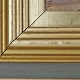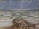 Oliemaleri på lærred i guldmalet træramme. Havmaleri med motiv af et stendige ved kysten.