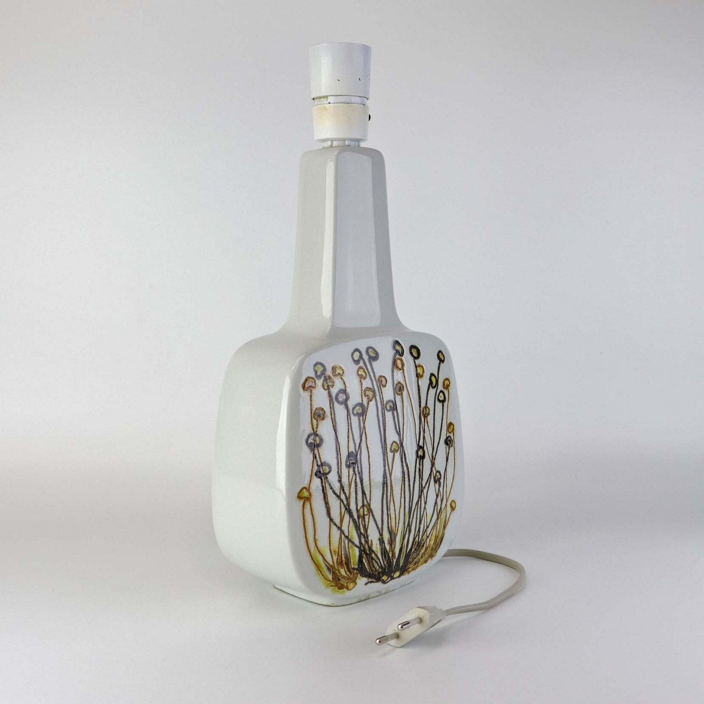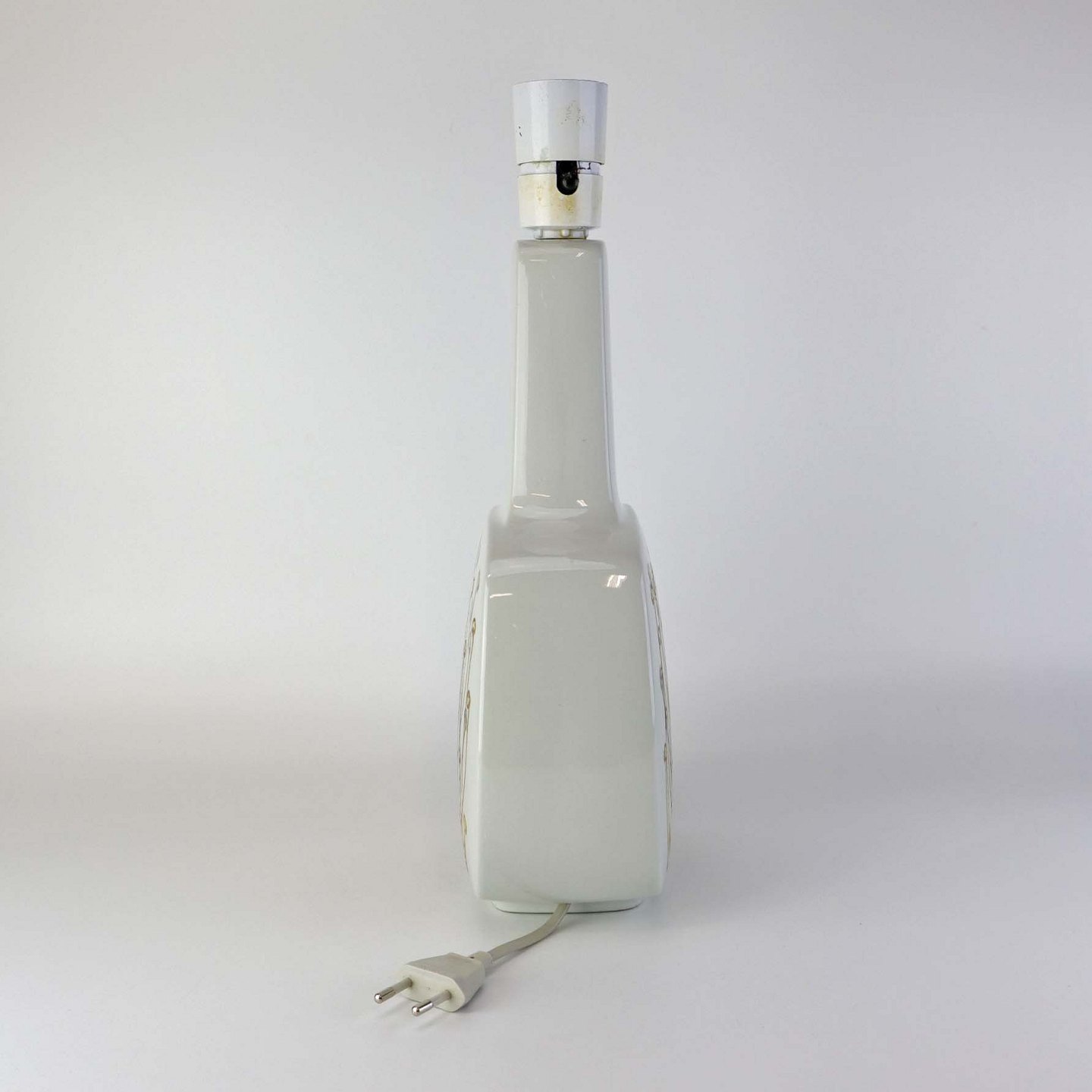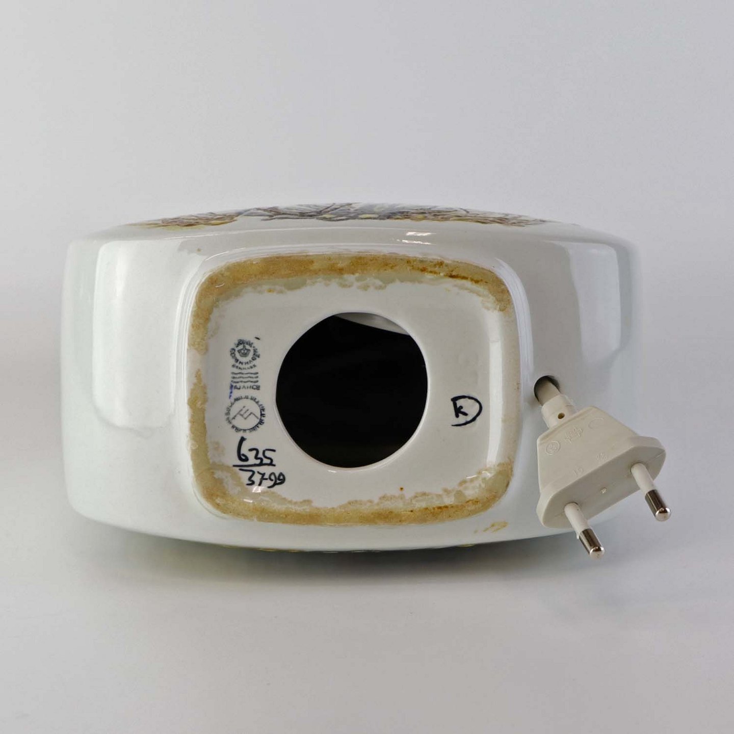 Lampefod i fajance fra Baca serien med naturmotiv i brune og gyldnefarver på lys baggrund. Ledningen er opbevaret i lampefoden. Nr 635/3799