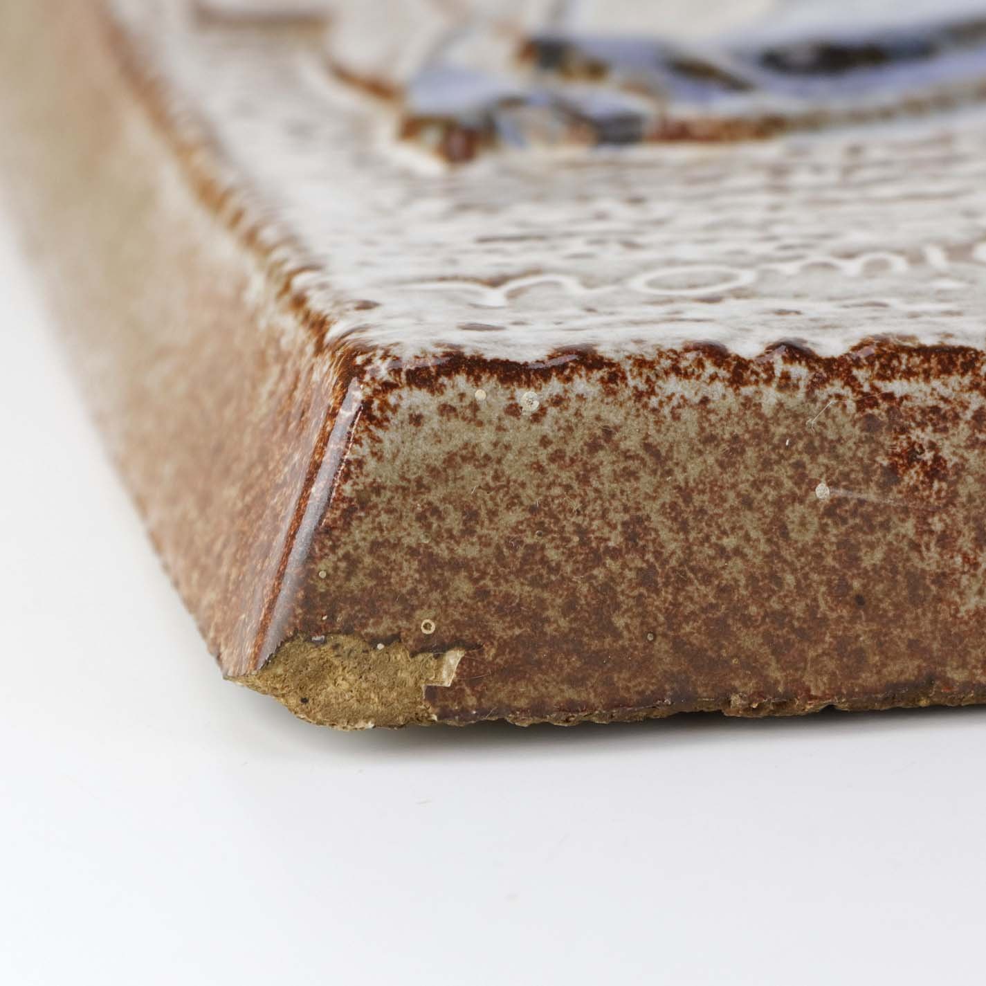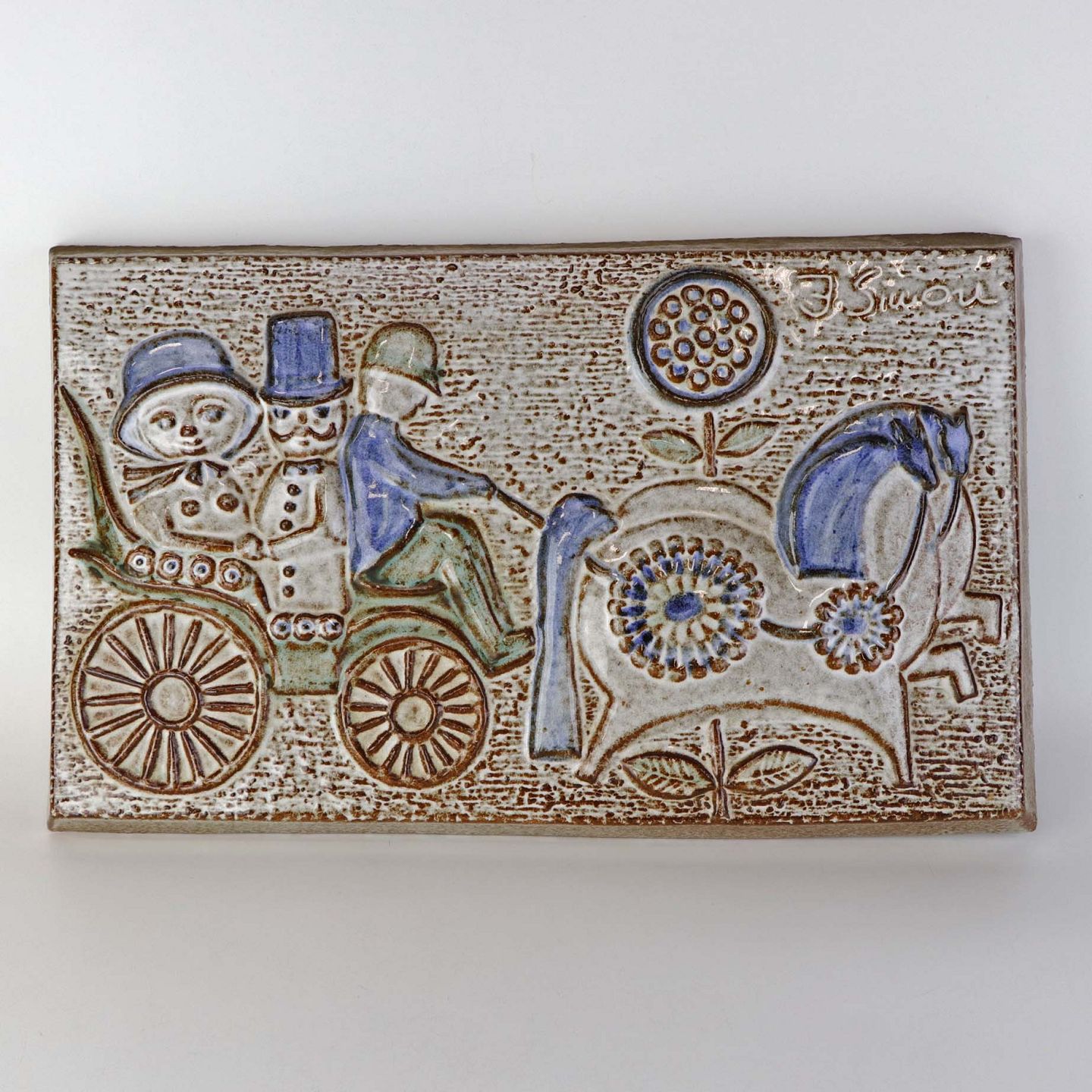 Relief i glaseret stentøj med motiv et par på karret tur med kusk og heste. Nr. 3582