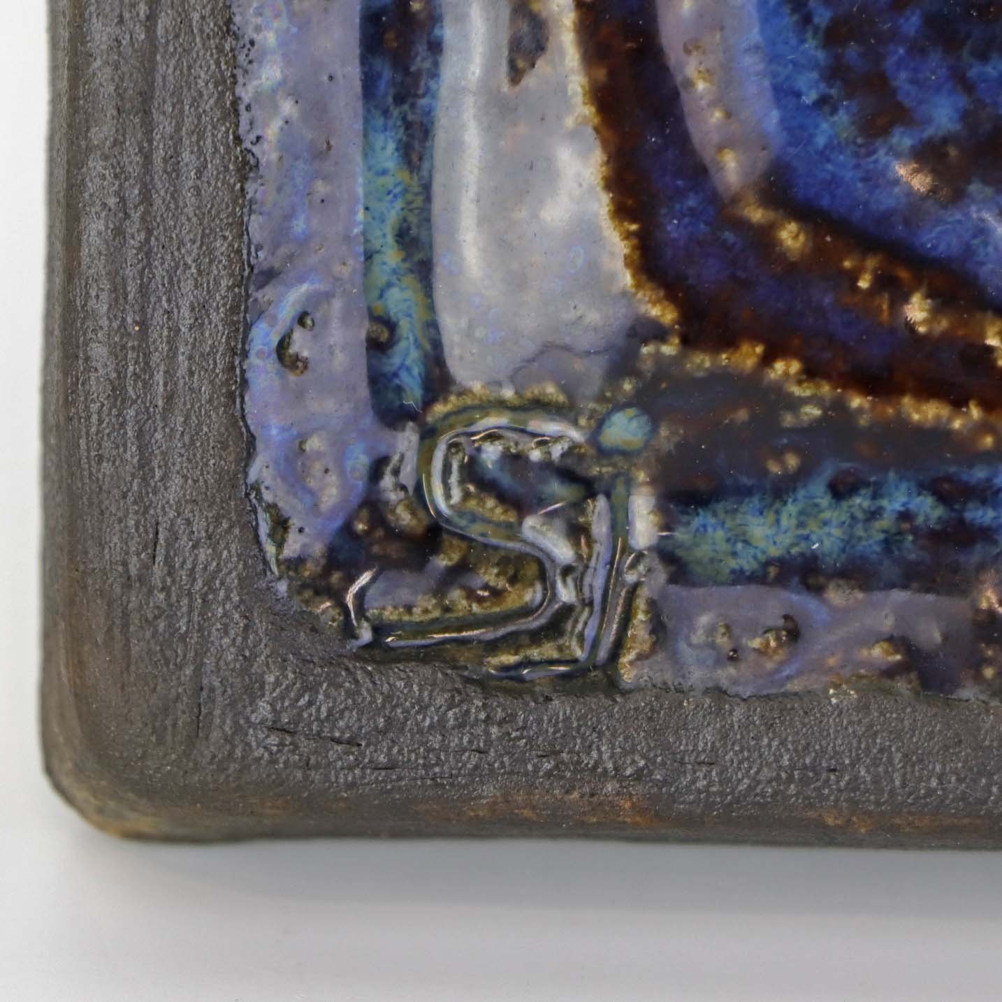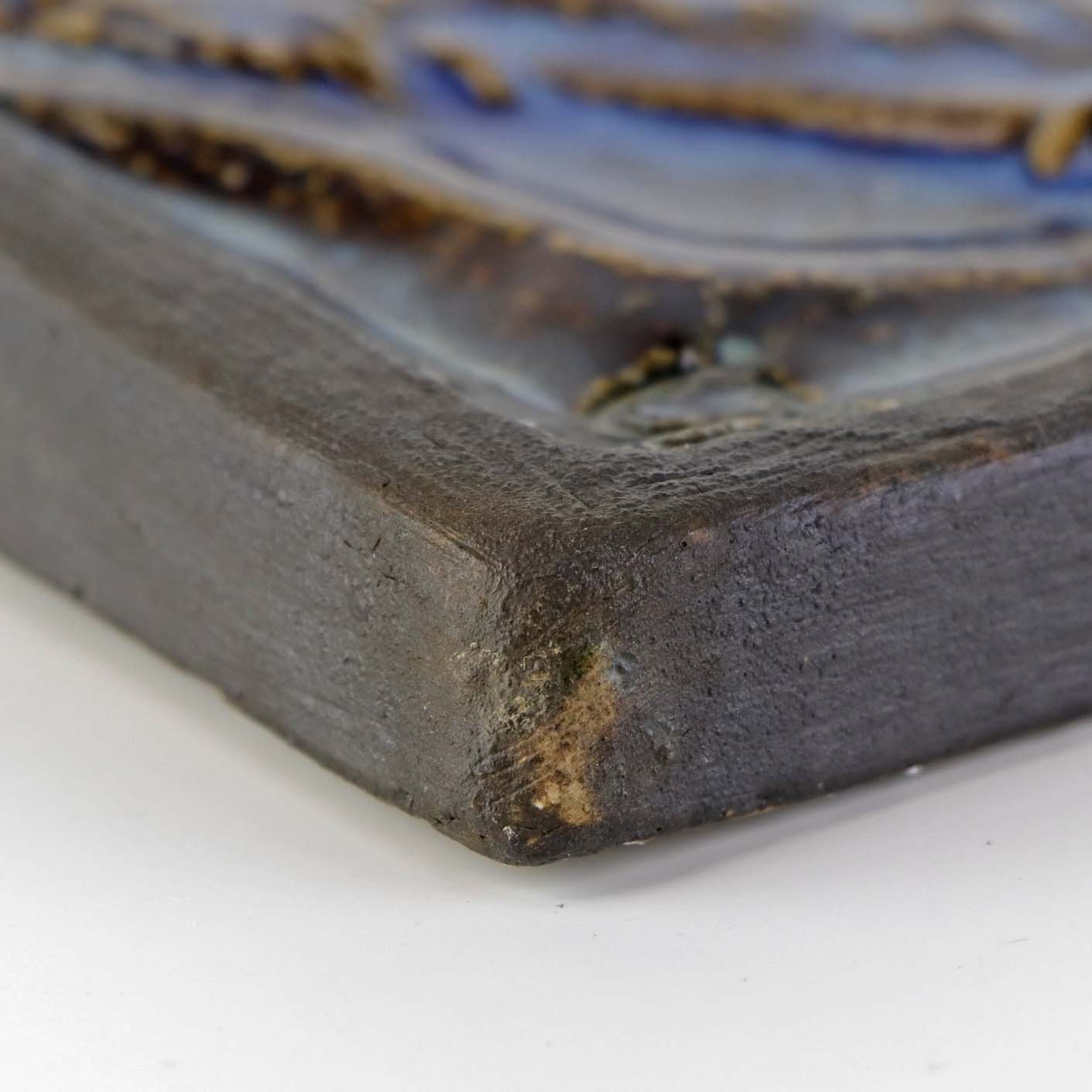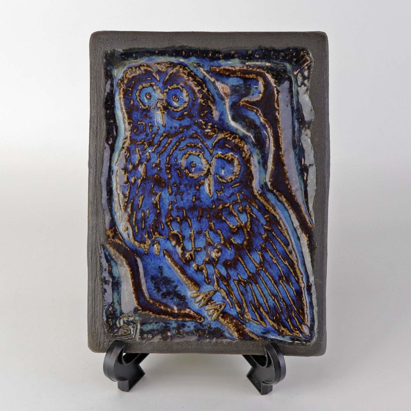 Relief i blå glaseret stentøj med motiv af to ugler på en gren. Nr. 3502