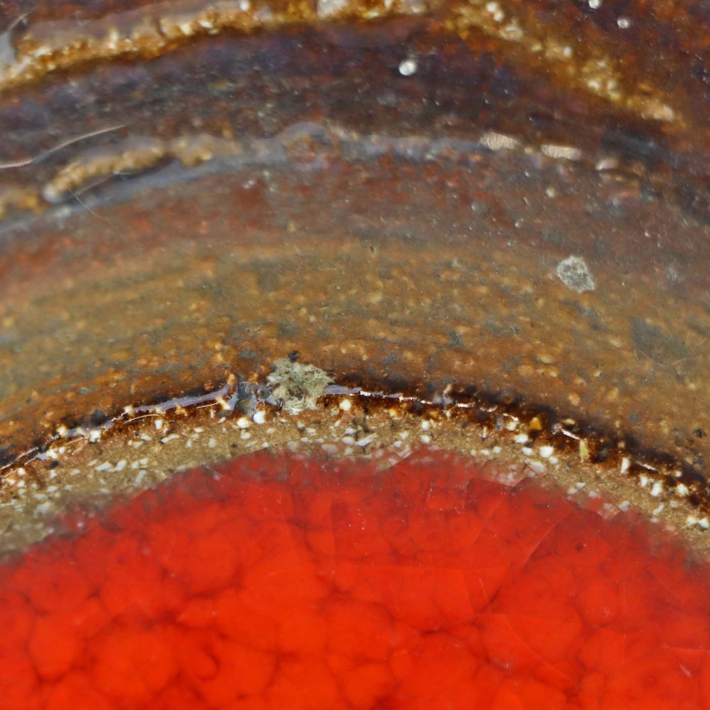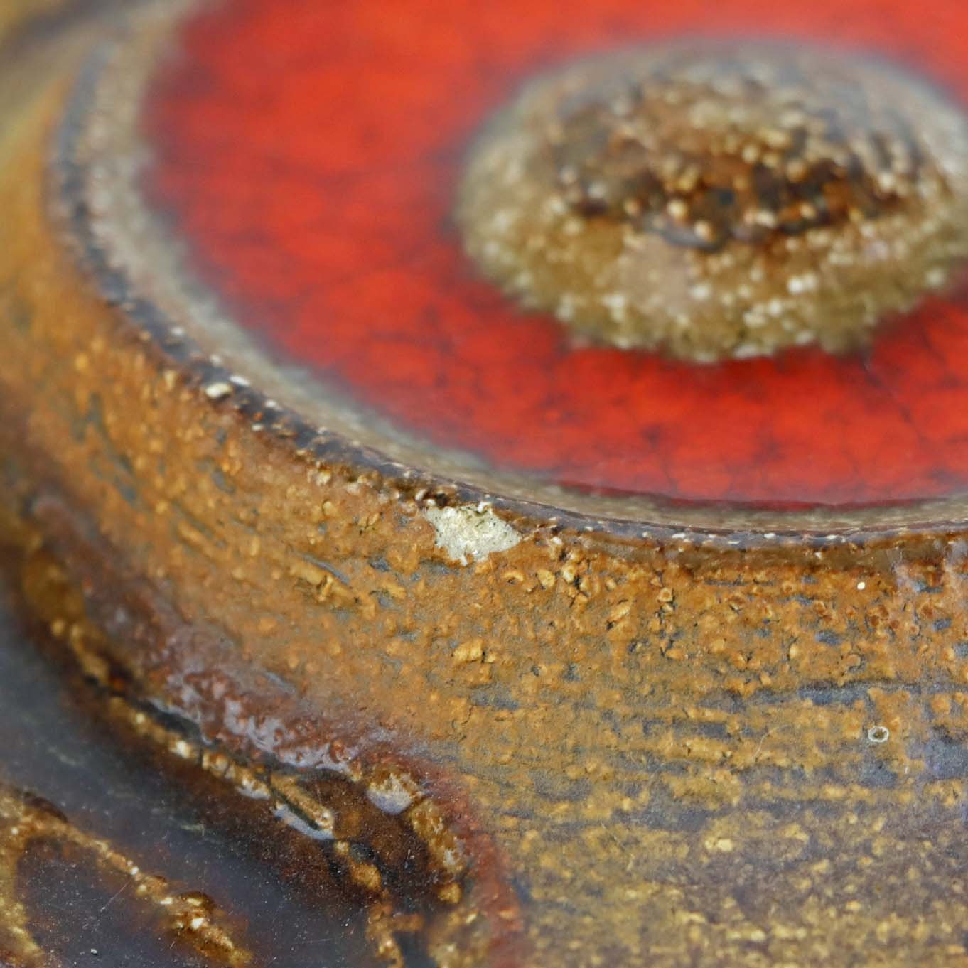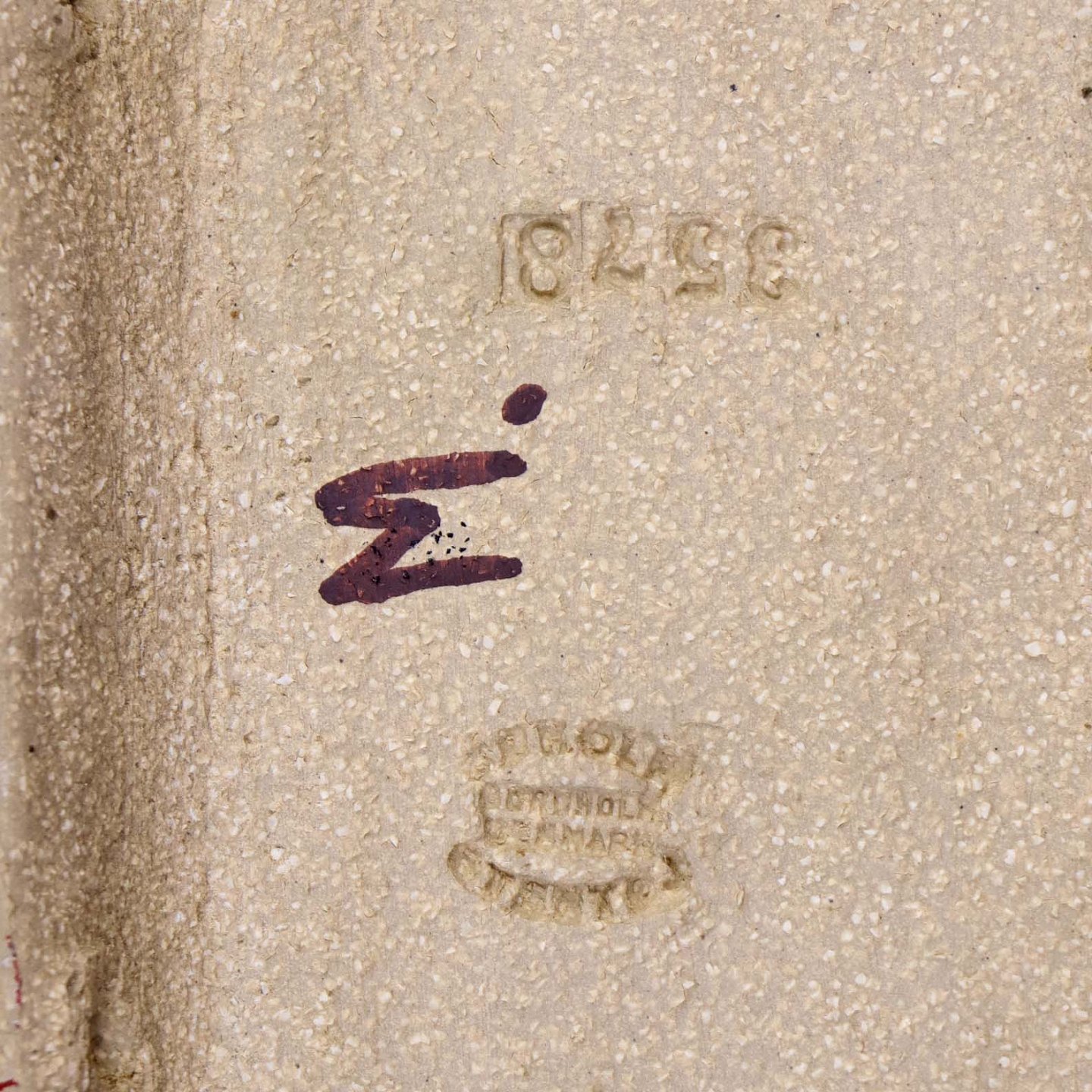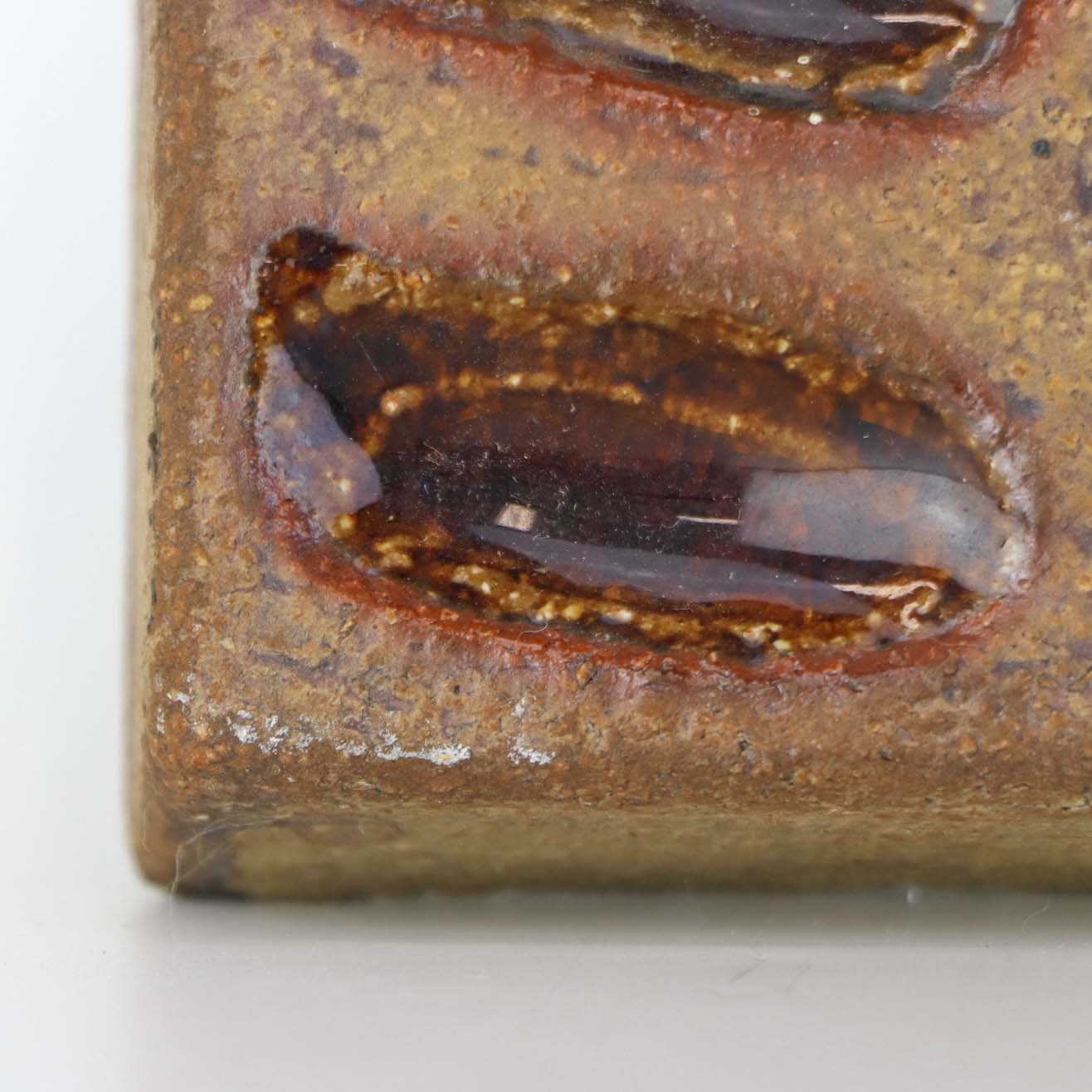 Relief i delvist glaseret stentøj med motiv blade over orangerøde runde blomster. Nr. 3578