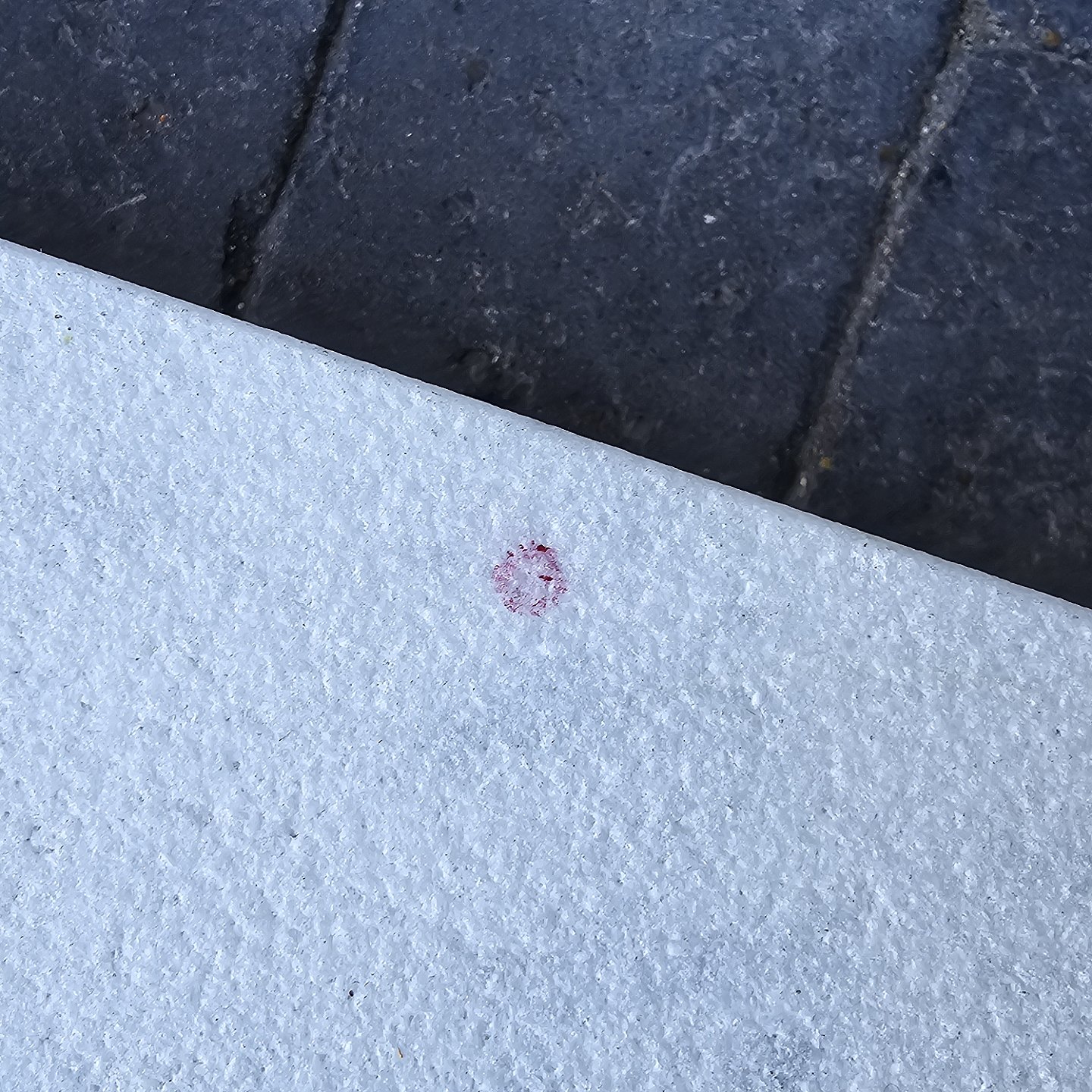Der er slået to hjørner af bordpladen under bunden og en rød plet ovenpå.