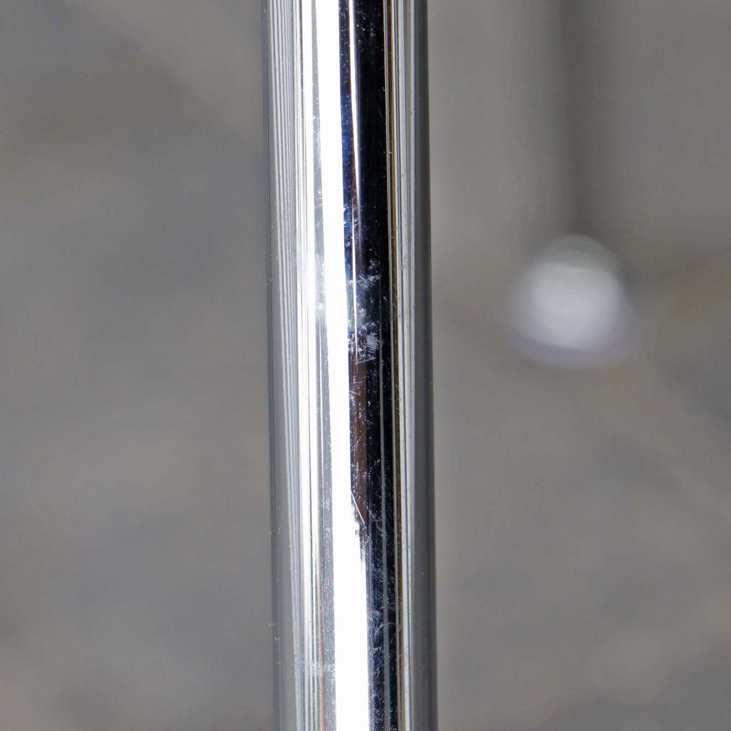 Spisebordsstol med ben i rustfrit stål og polstret sæde betrukket med brun og hvid meleret stof. Model Dråben nr. 3110