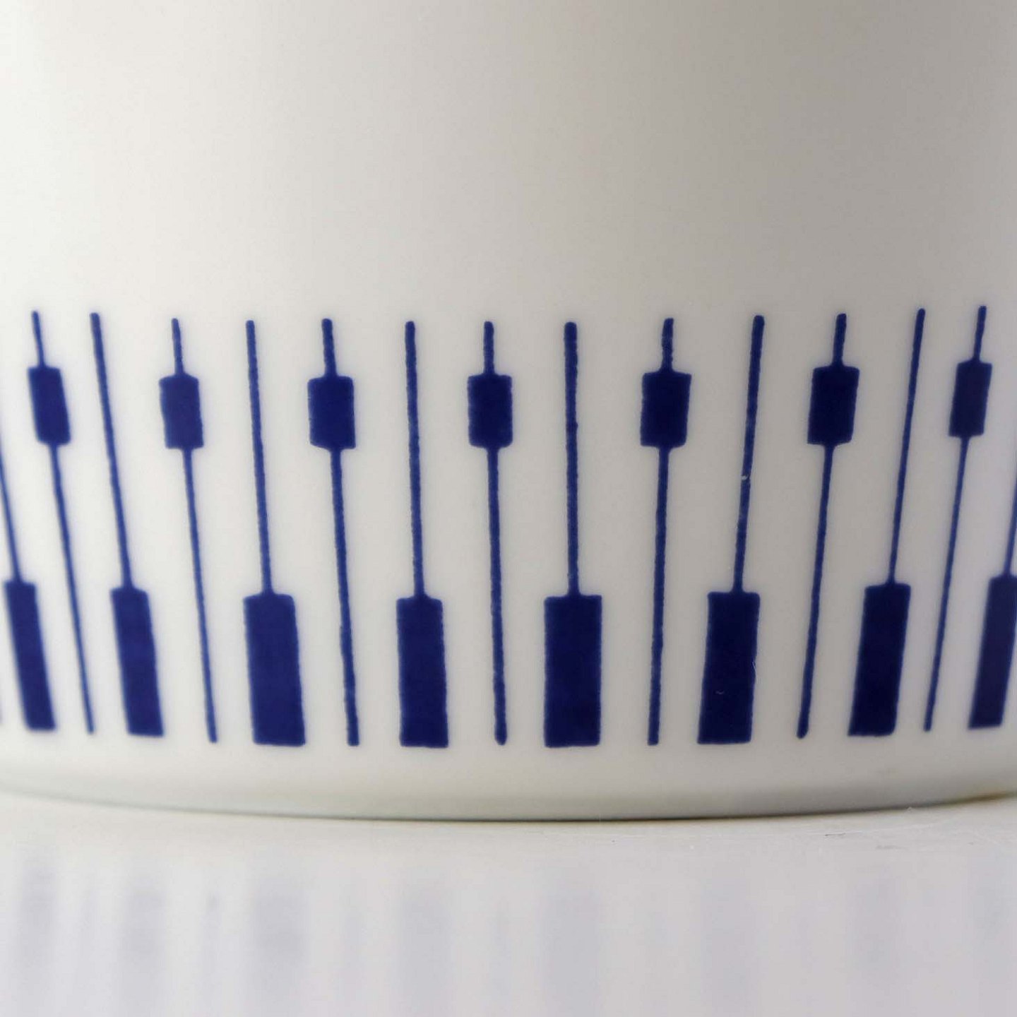 Stellet er fremstillet i ildfast glat porcelæn dekoreret med mørkeblå tangenter på hvid baggrund.