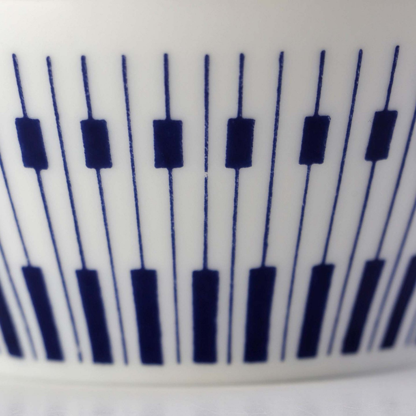 Stellet er fremstillet i ildfast glat porcelæn dekoreret med mørkeblå tangenter på hvid baggrund.
