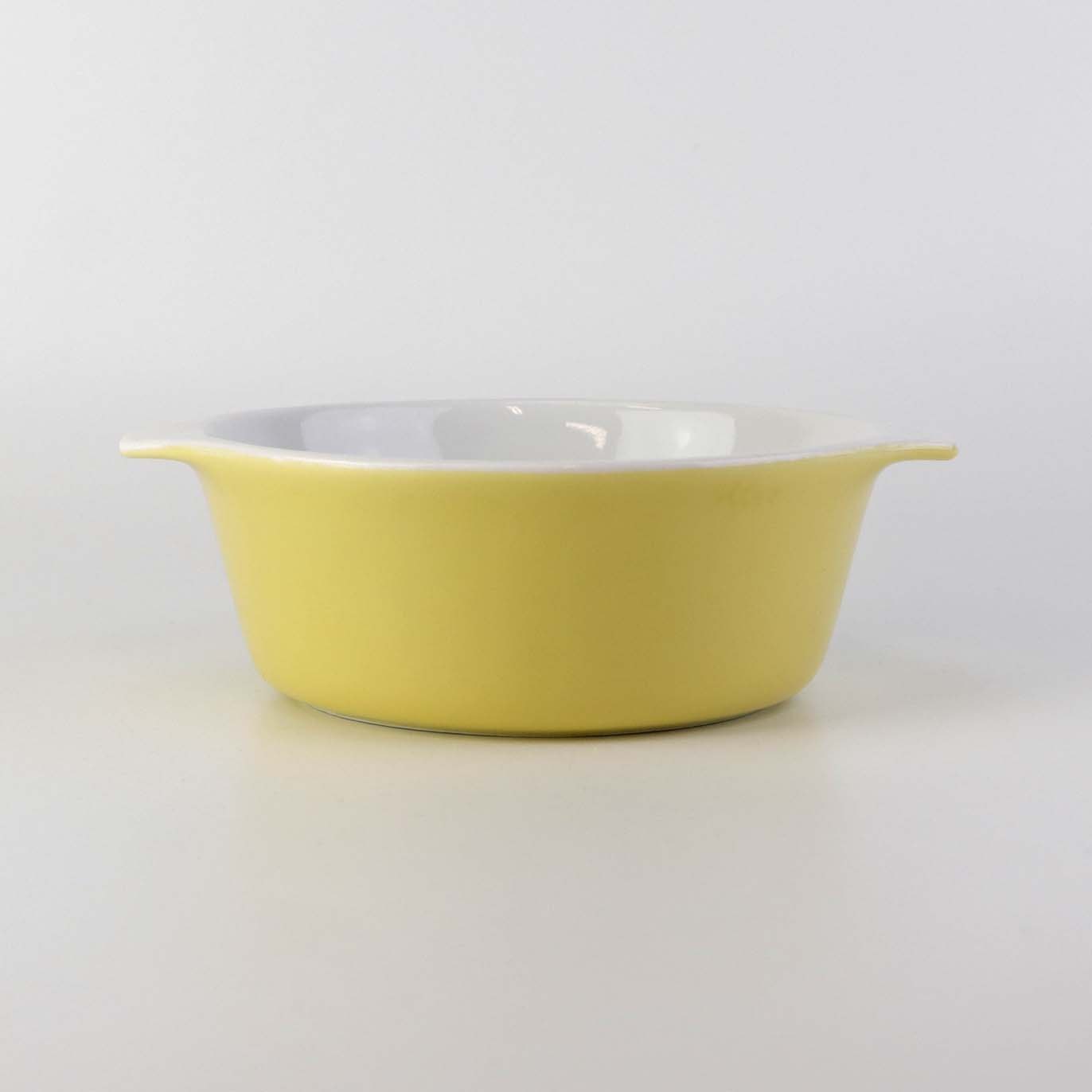 Stellet er fremstillet i ildfast glat porcelæn dekoreret med gul glaseret yderside og hvid glaseret inderside.