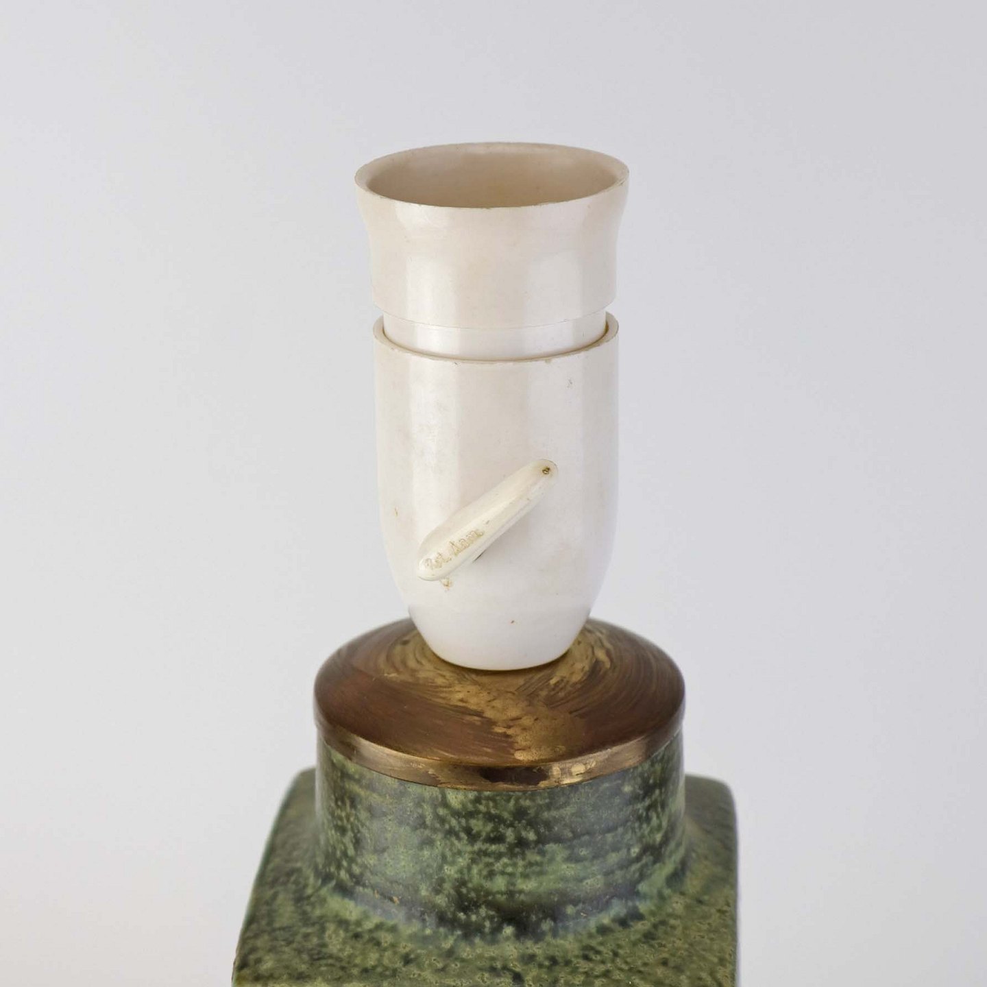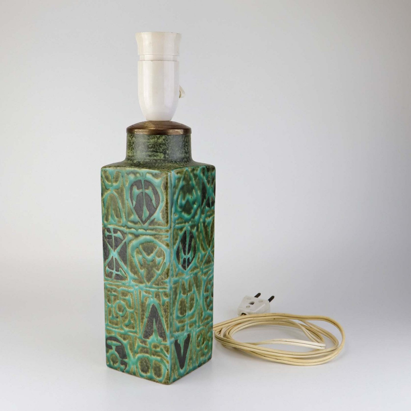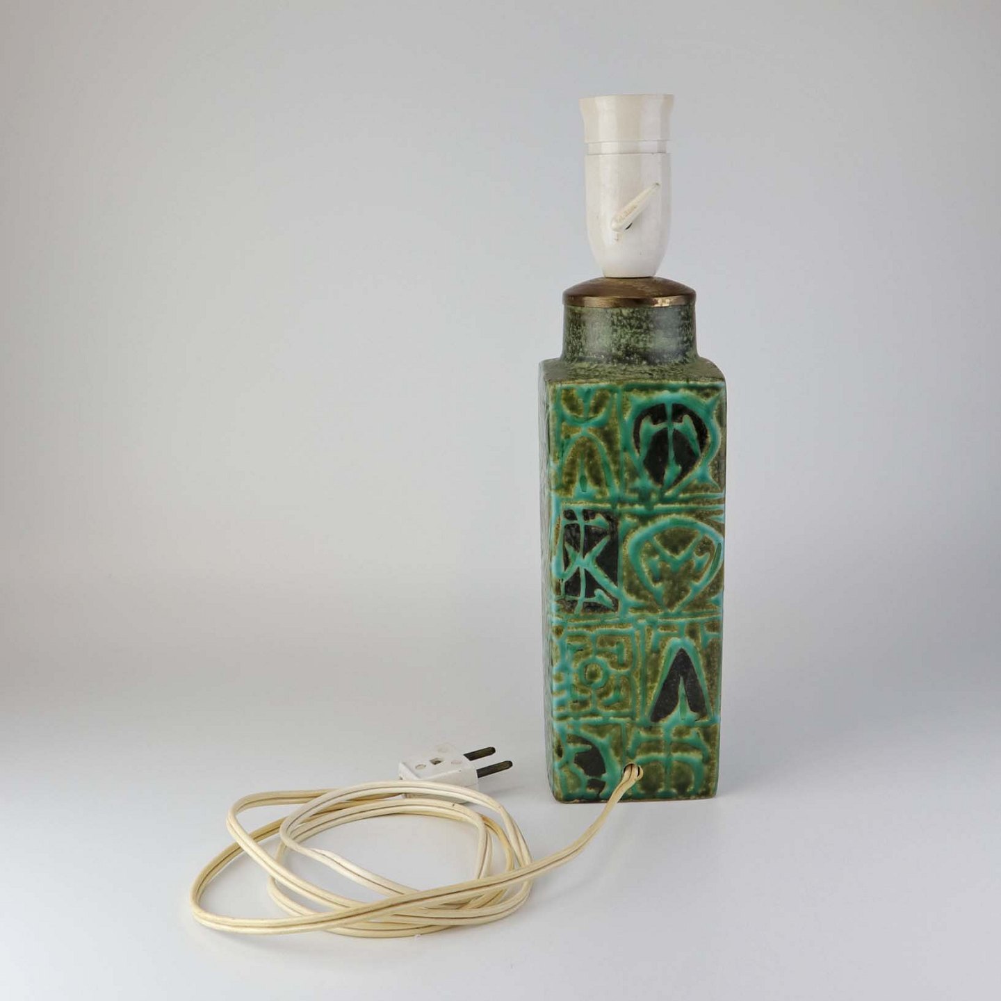 Lampefod i grøn fajance med topplade i rustik messing. Lampen er fra Baca serien og dekoreret med abstrakt mønster. Nr. 712/3259