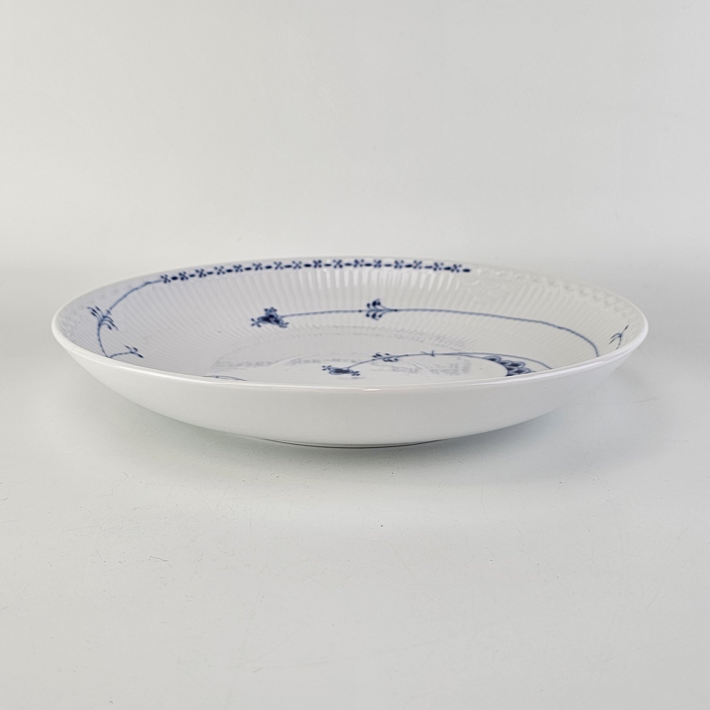 Fremstillet i riflet hvidt porcelæn med nyfortolkede dekorationer fra stellene Musselmalet Halvblonde og Prinsesse