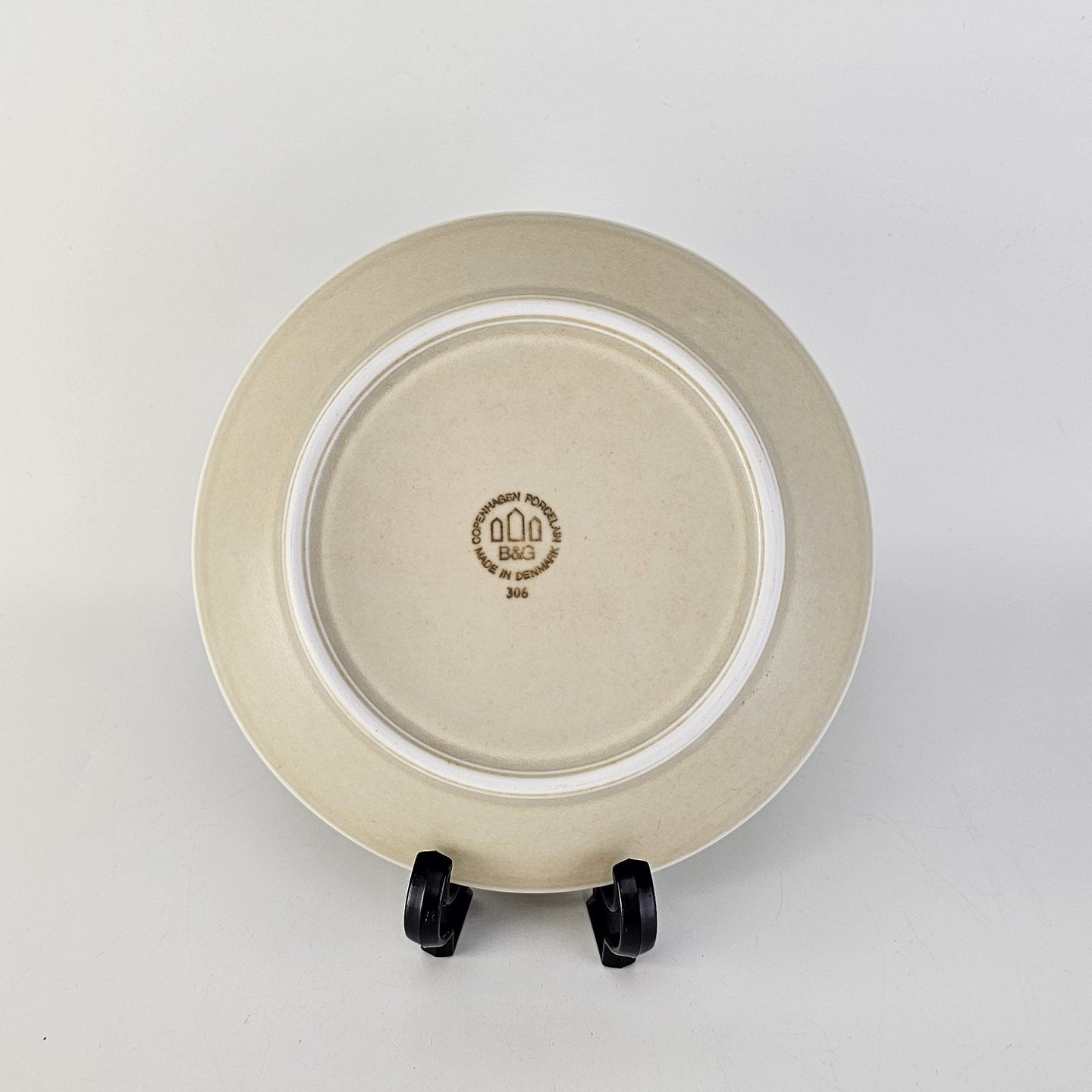 Dessert tallerken i stentøj fra stellet Edith Sonne, mat hvid dekoreret med en blå stribe