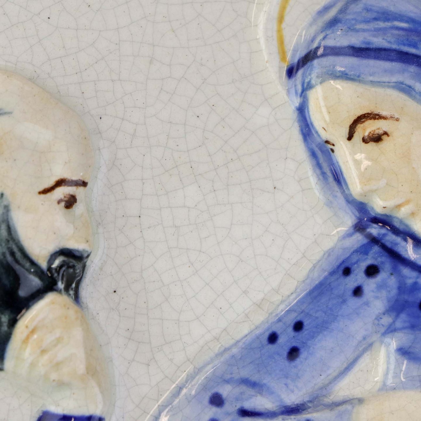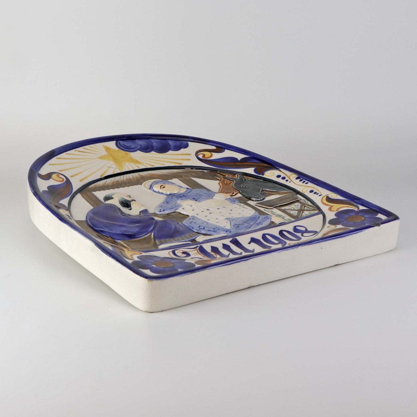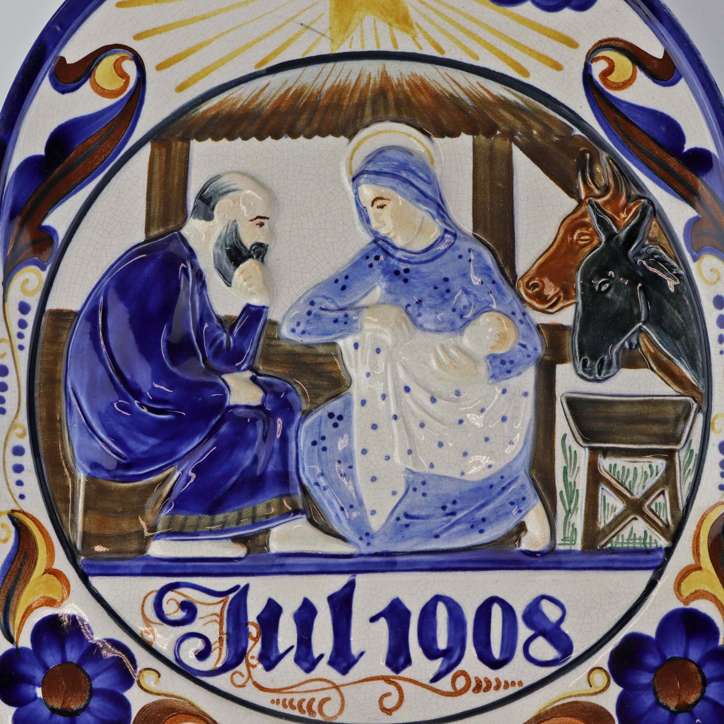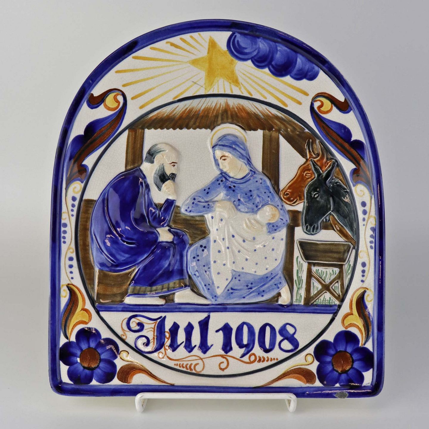 Ældre juleplatte fra år 1908 med motiv af Josef og Maria i stalden med lille barn Jesus omgivet af dyr og ledestjernen. Nr. 630/556