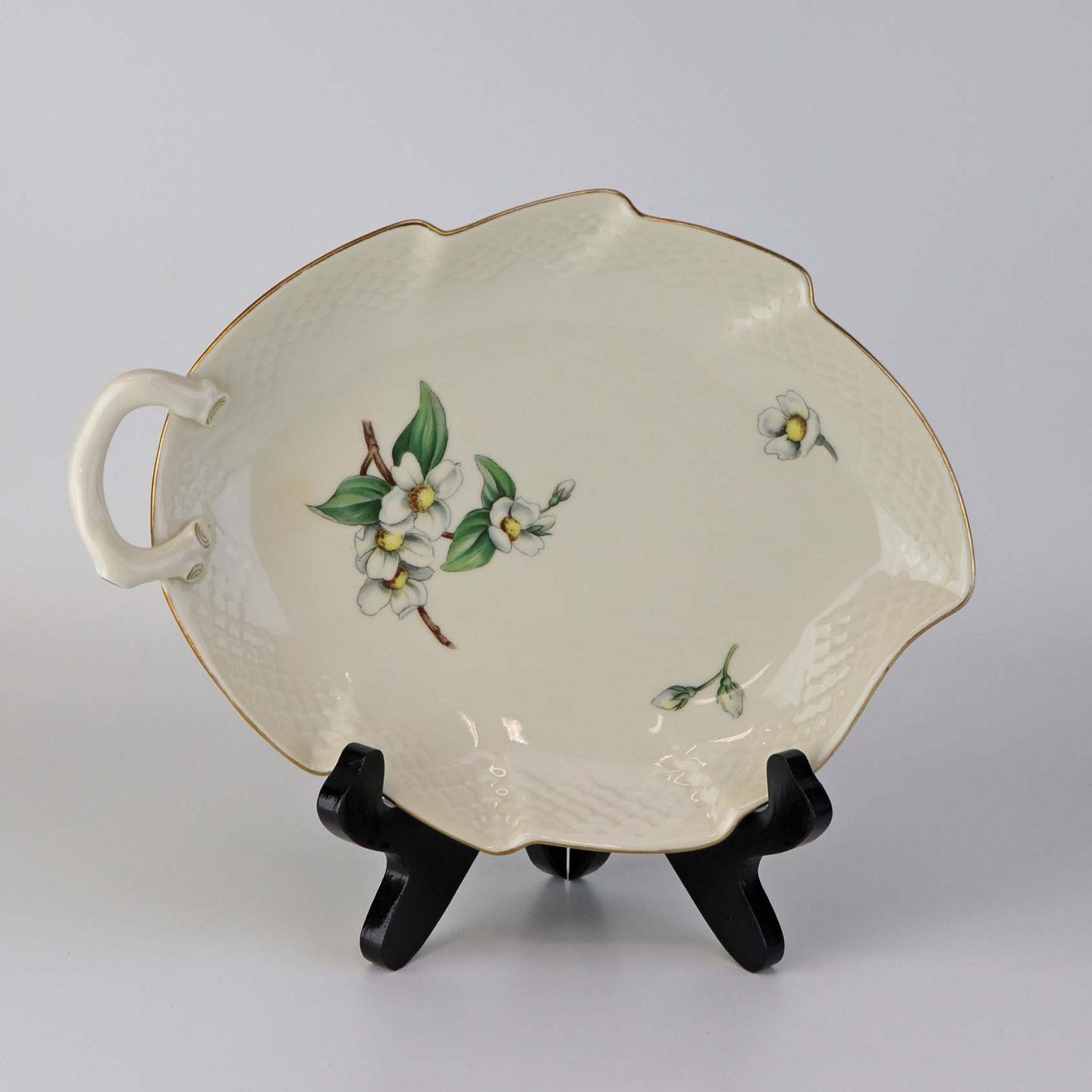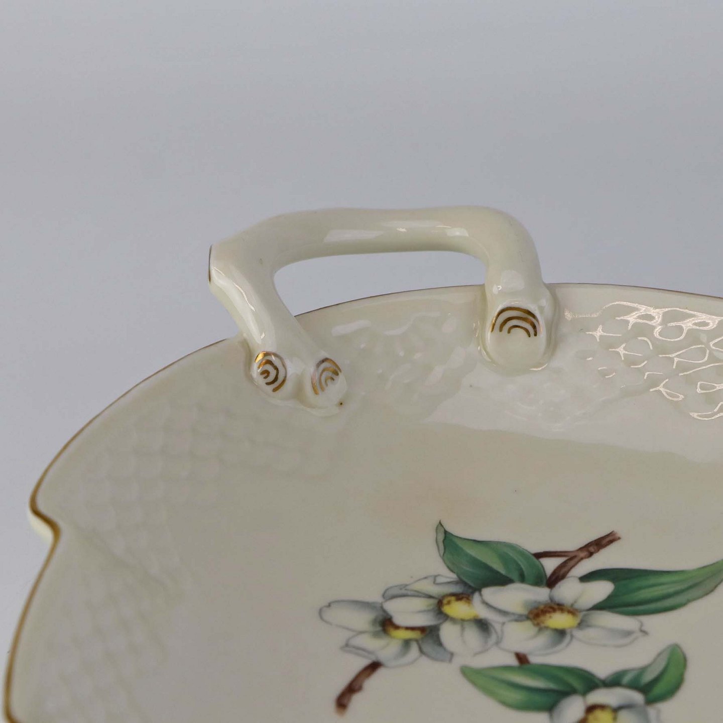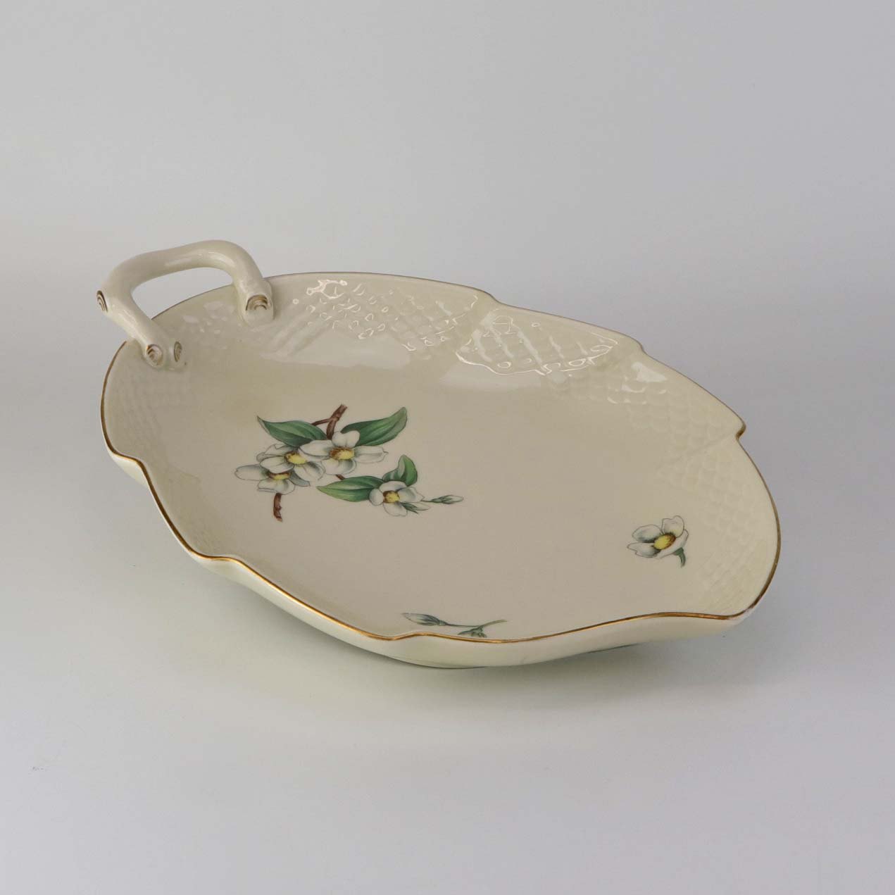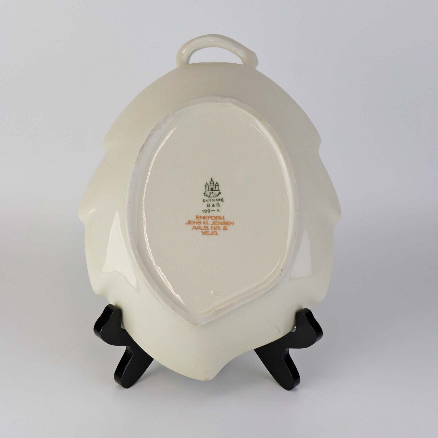 Bladformet kagefad med hank i porcelæn fra stellet Heimdal. Nr. 199