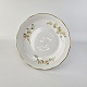 Service i hvidt porcelæn med hamret kantmønster dekoreret med gule blomsterranker og lyslilla streg. Stellet er med guldkant og det er mærket med bølger anvendt frem til 1890.