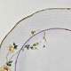 Service i hvidt porcelæn med hamret kantmønster dekoreret med gule blomsterranker og lyslilla streg. Stellet er med guldkant og det er mærket med bølger anvendt frem til 1890.