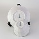 Service i kantet hvidt porcelæn dekoreret med lyserød og grå stribe ved kant.