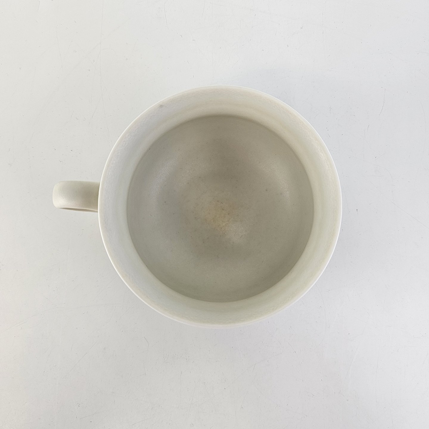 Kop og underkop i stentøj fra stellet Edith Sonne, mat hvid dekoreret med en blå stribe