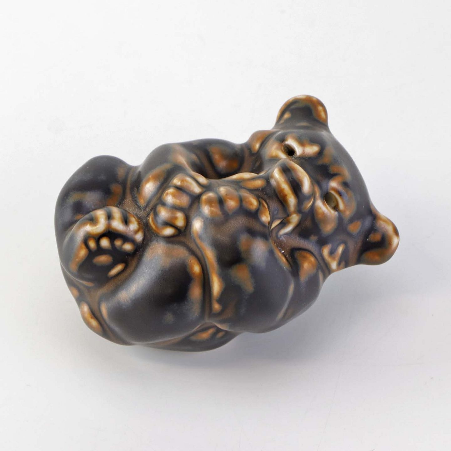 Figur i brunglaseret stentøj med motiv af liggende bjørneunge med pote i munden. Nr. 21434