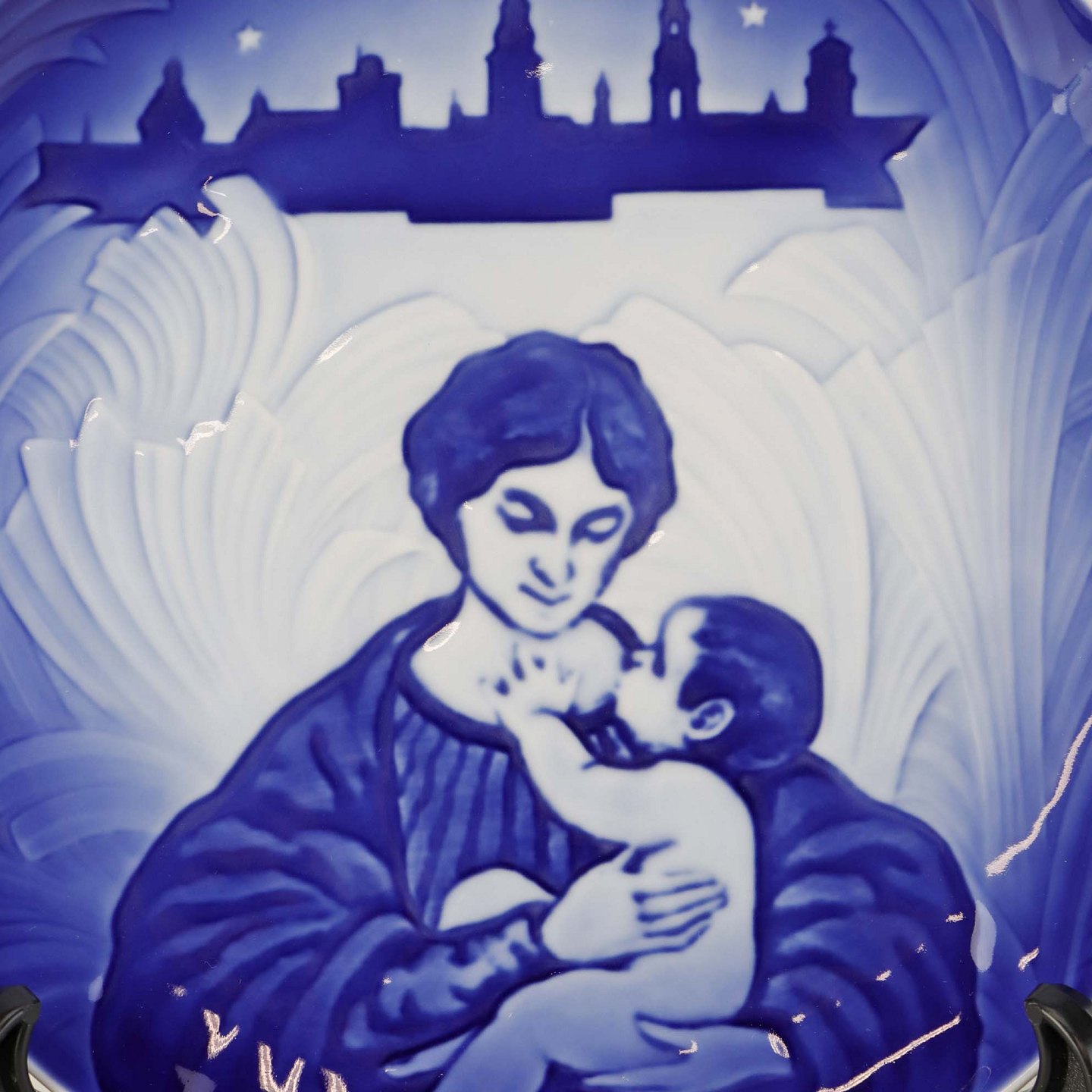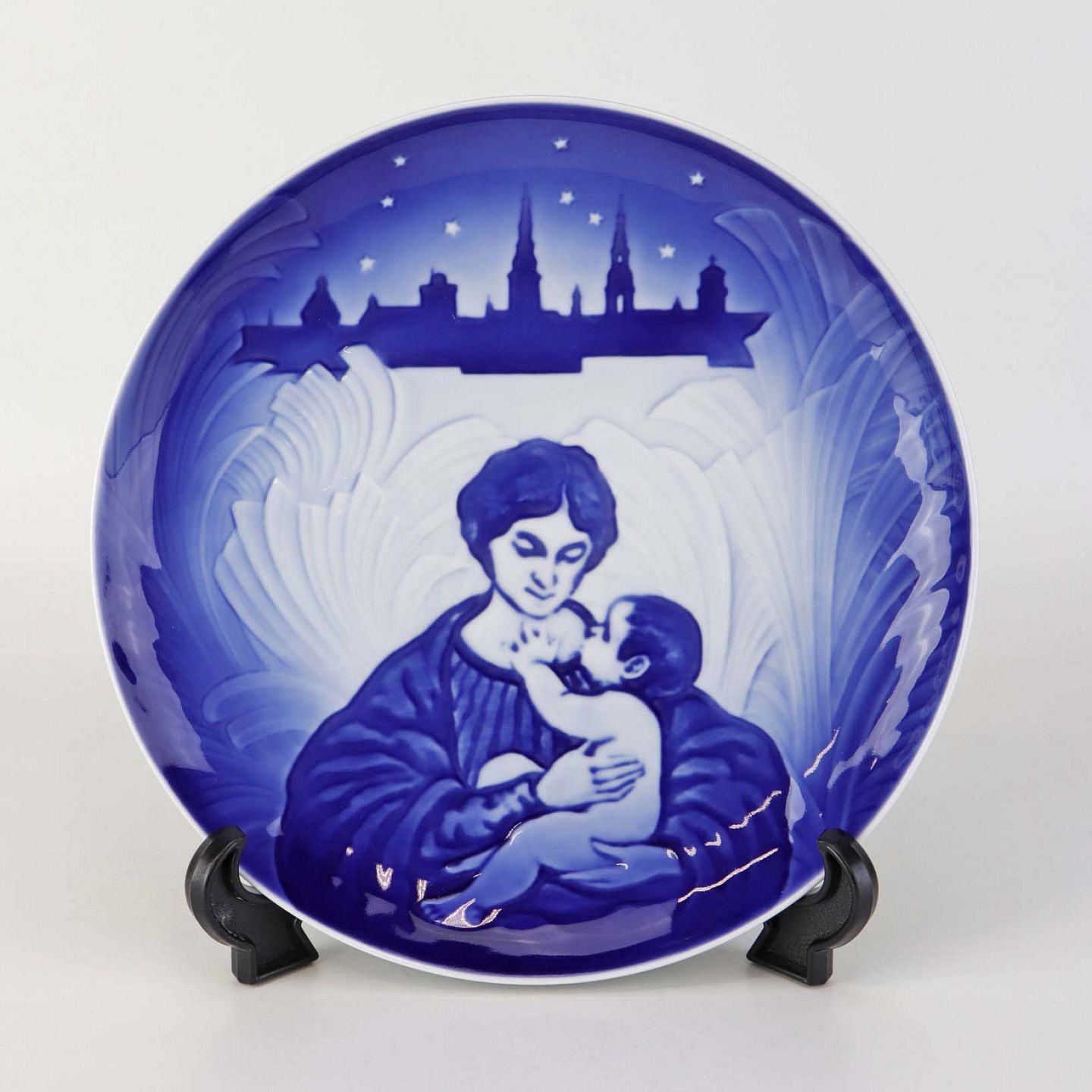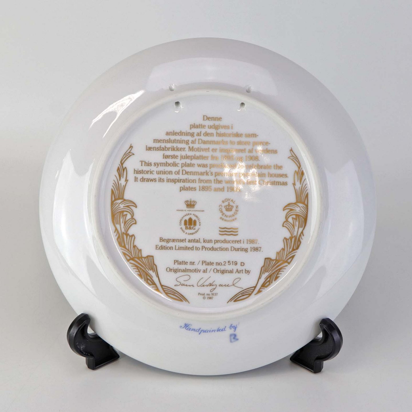 Håndmalet mindeplatte i porcelæn fra år 1987 i anledningen af sammenslutningen af Danmarks to store porcelænsfabrikker Bing & Grøndahl og Royal Copenhagen. Motivet er inspireret af juleplatten fra år 1895 og år 1908.