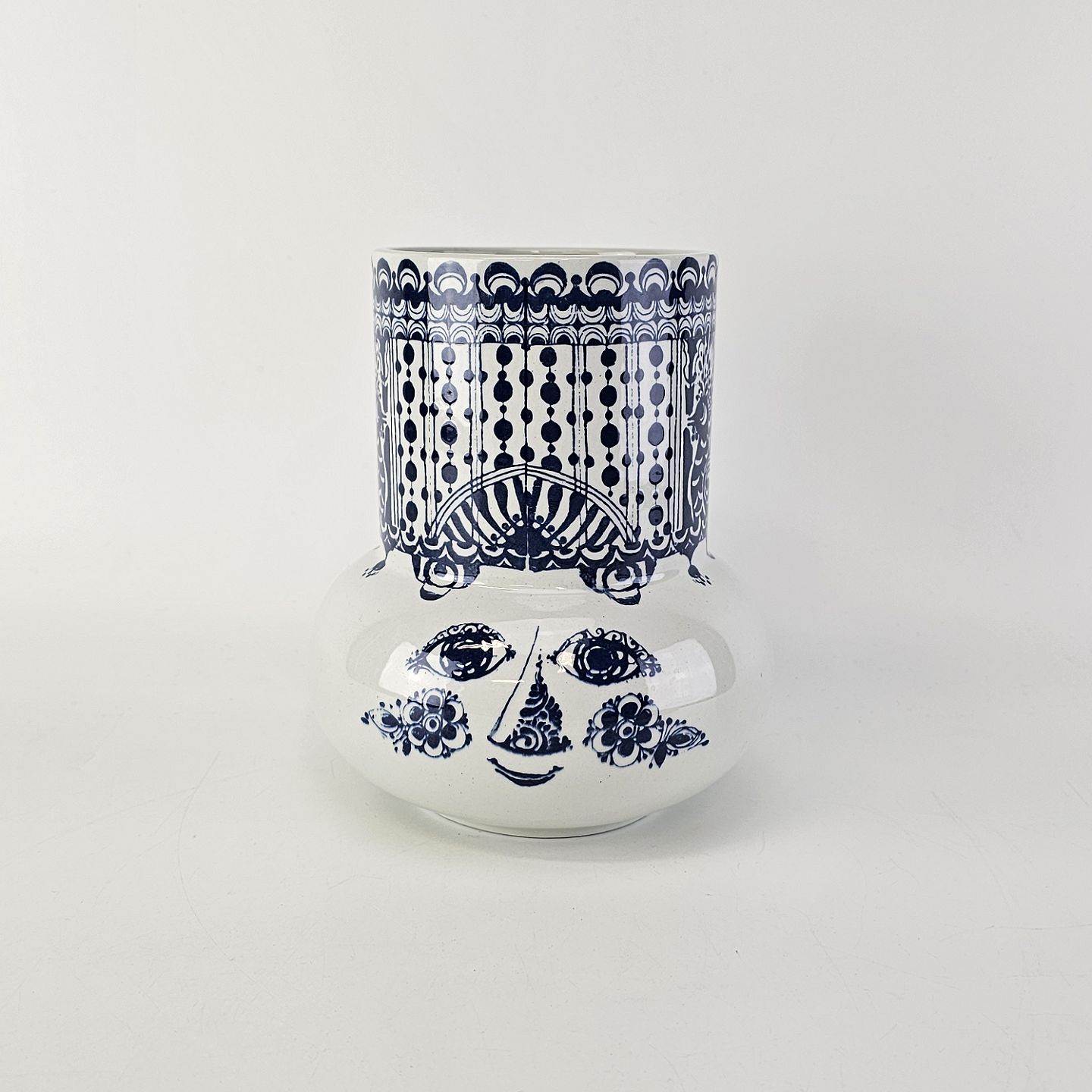 Vase i keramik med motiv af et kvindeansigt og mønster