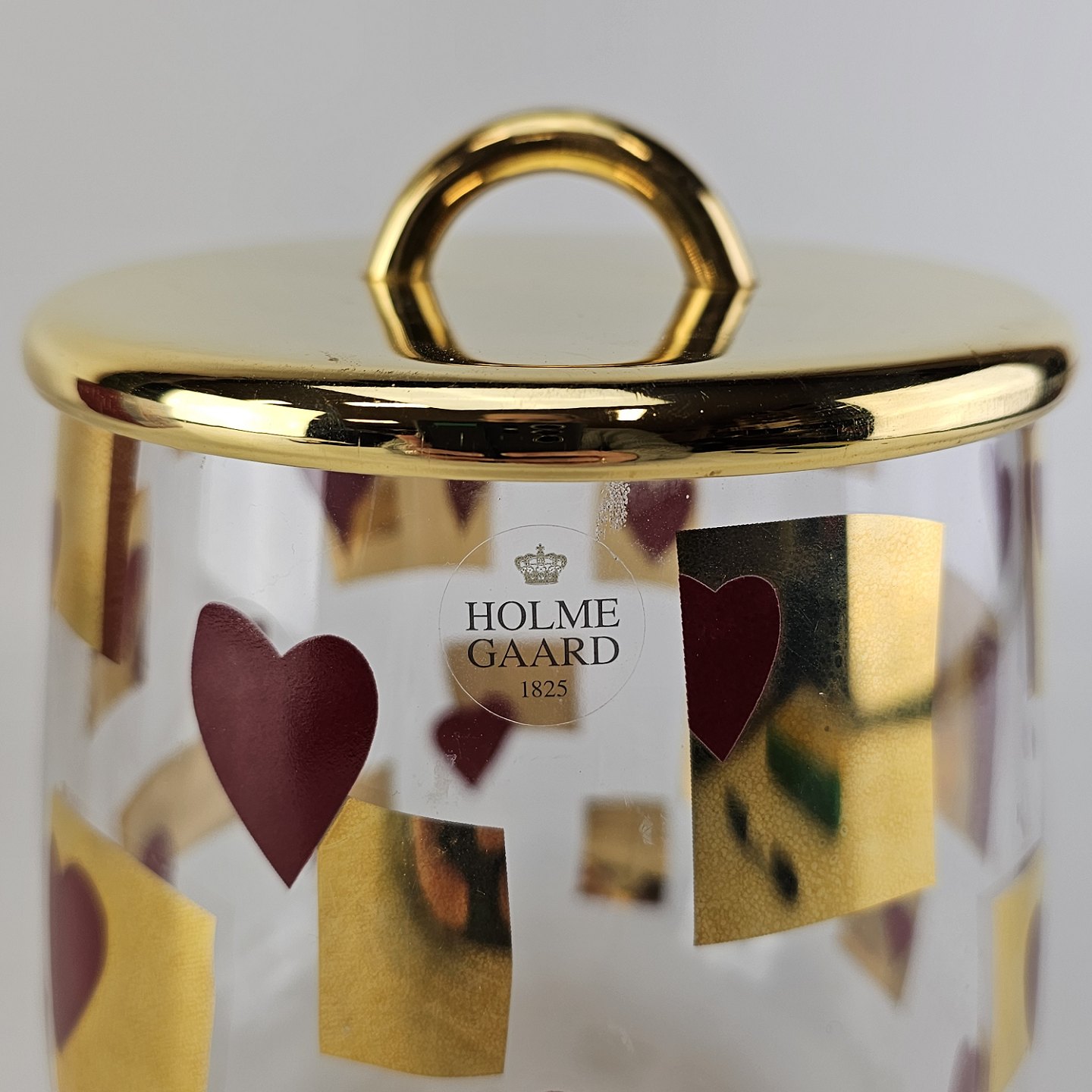 Kagedåse af glas med mønster af røde hjerter og gyldne firkanter