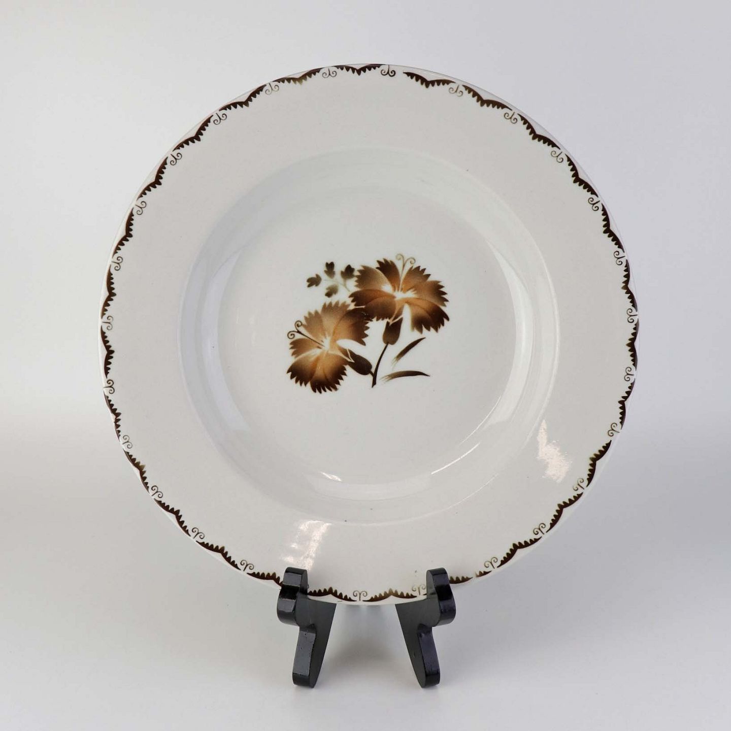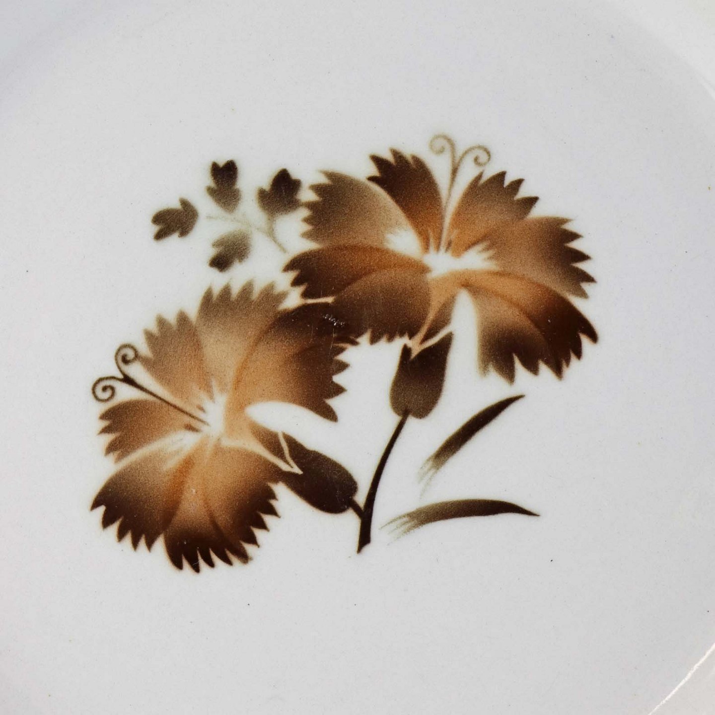 Stel i glat hvid fajance i stelform C med dekoration af brune nelliker og ranker. Stellet blev produceret i perioden år 1930-1941