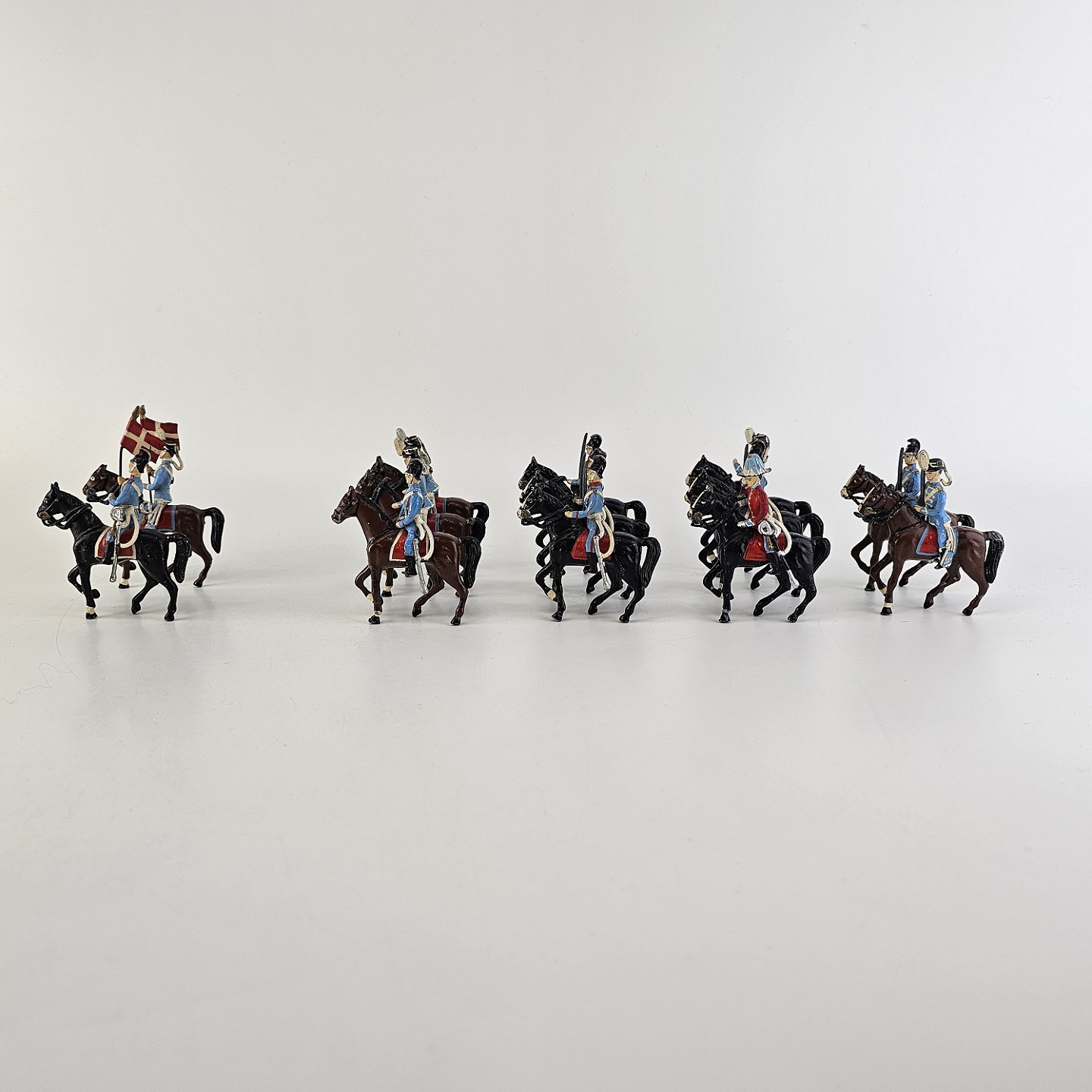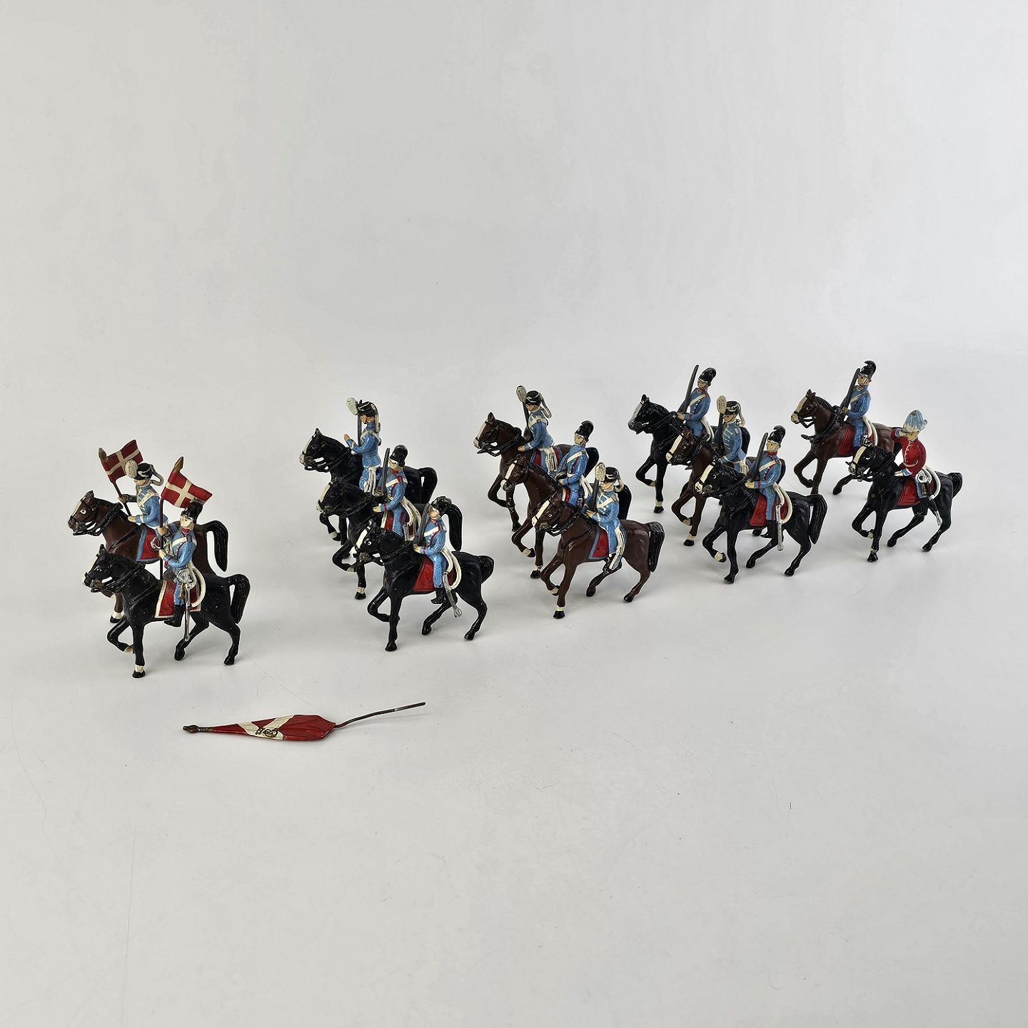 13 figurer af dragoner på heste i tin. Seks brune heste og syv sorte heste, to dragoner rider med flag og ni med sabler, og en løs fane