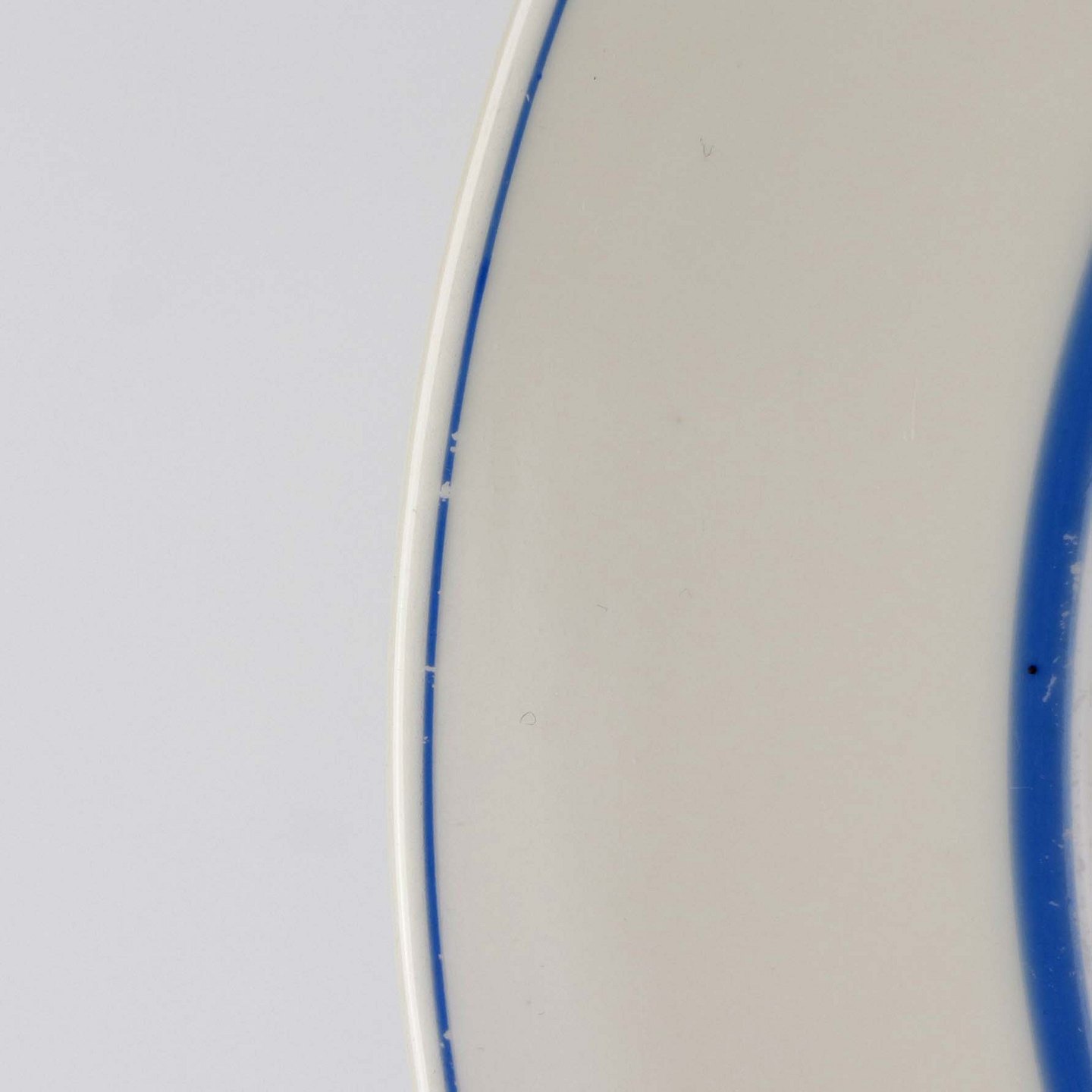 Service i glat lyst porcelæn med blå kantstreg og dekoration med horn samt blå og røde blomster.