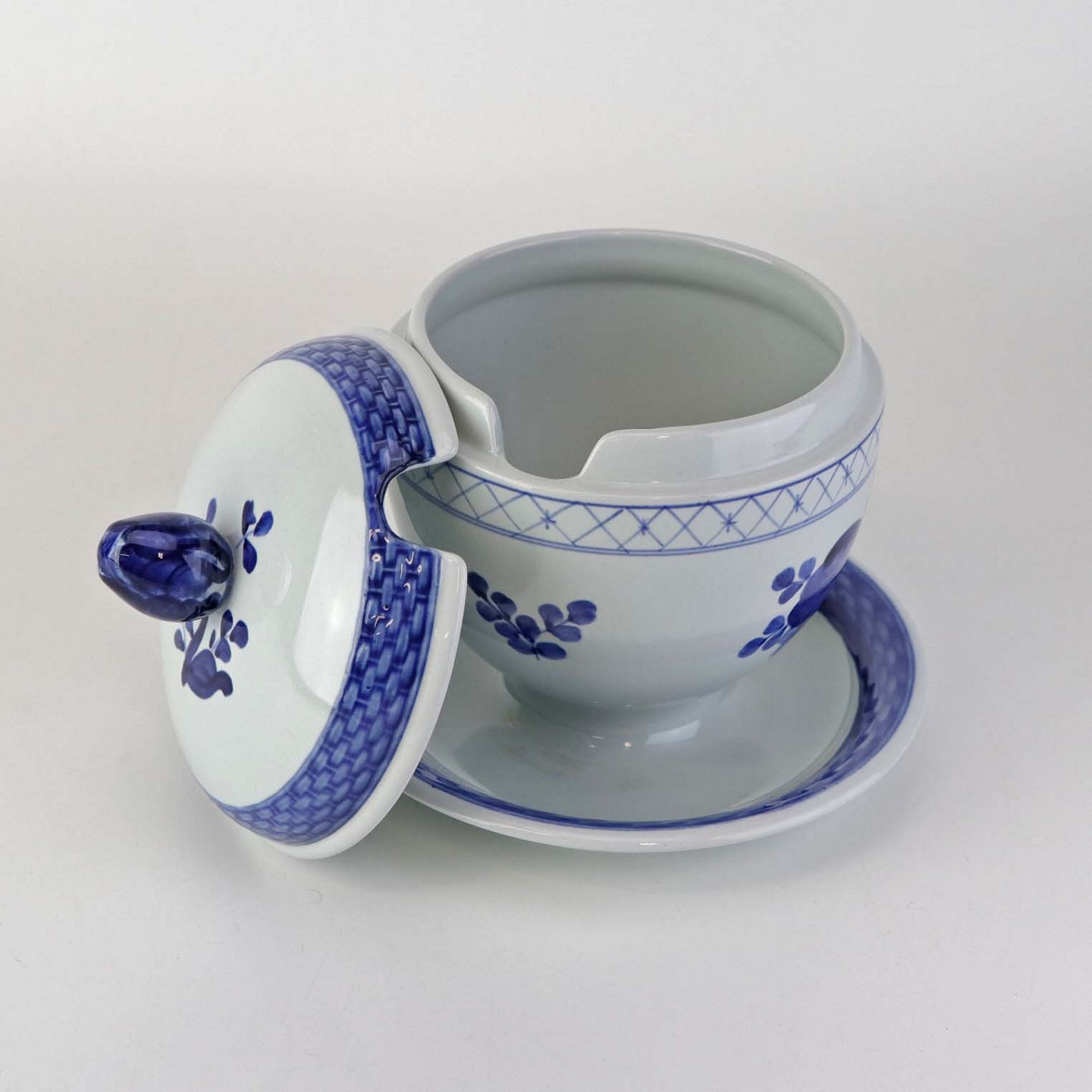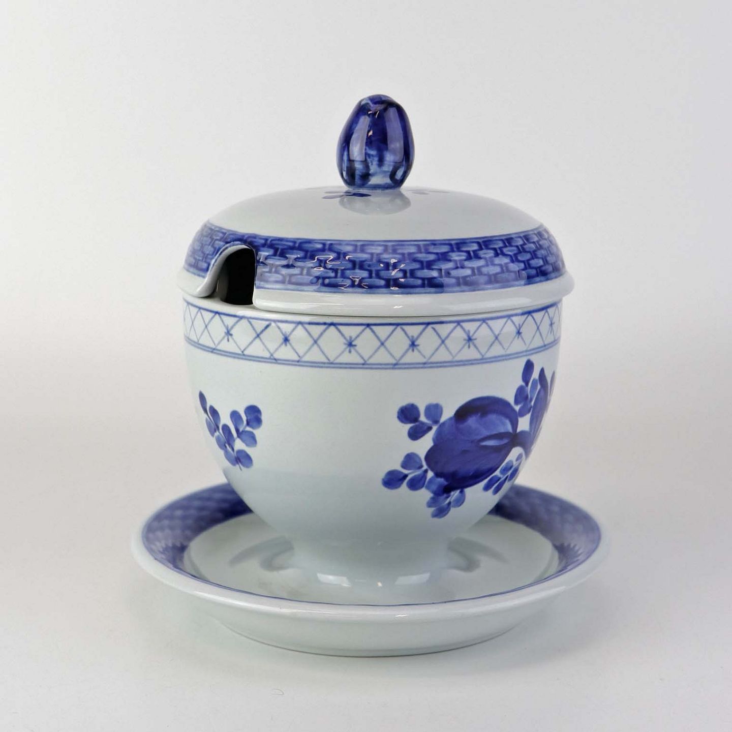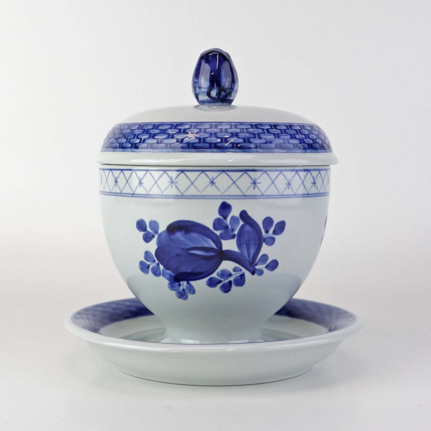 Glat Lyst fajance med blå dekoration af blomster og blå bort.