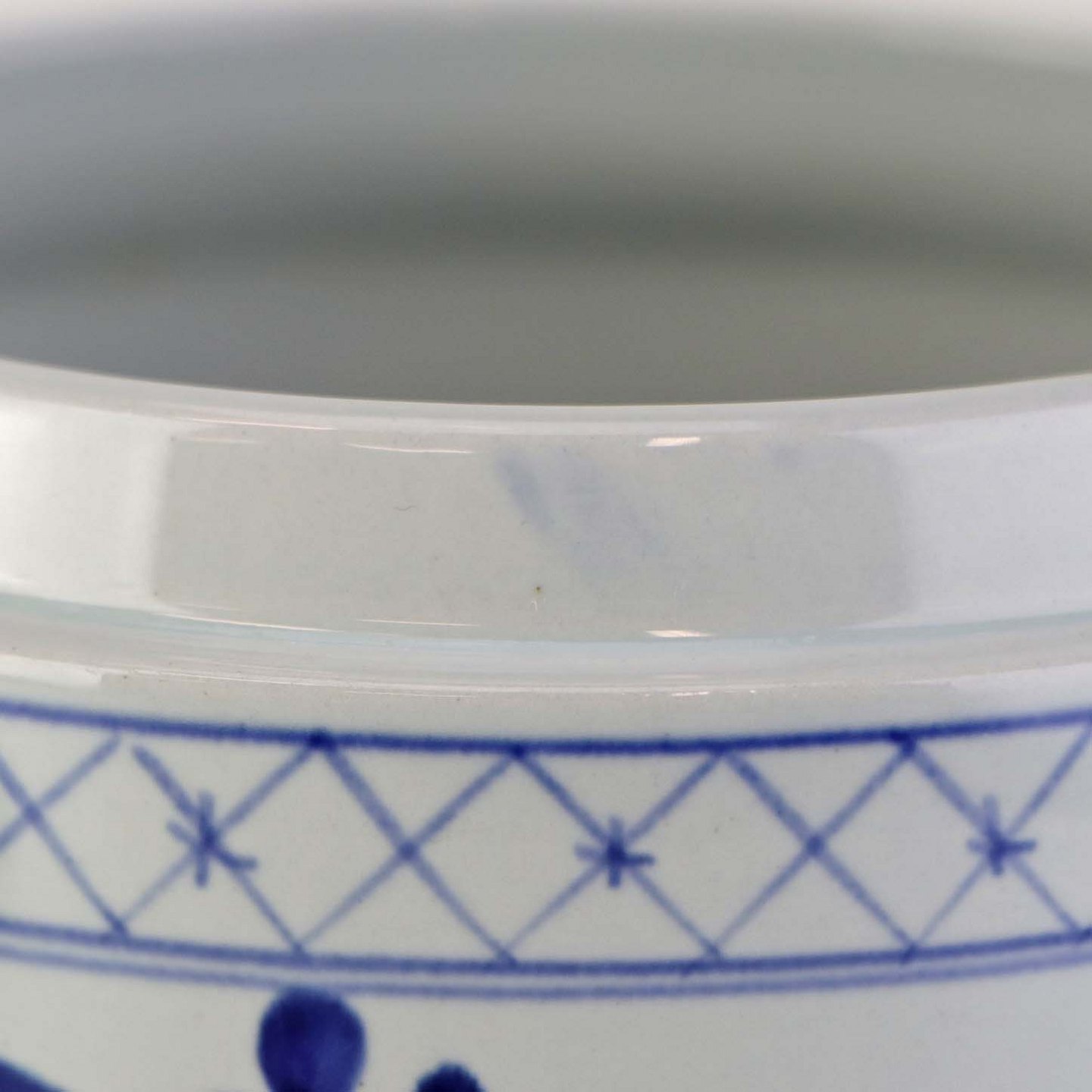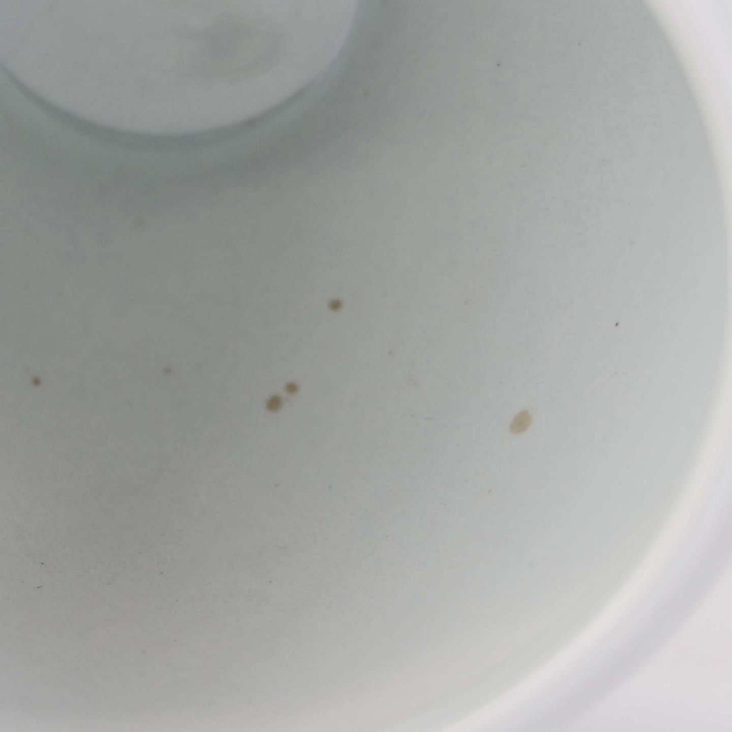 Fremstår med mindre brune pletter under glasuren på krukkens indvendige side.