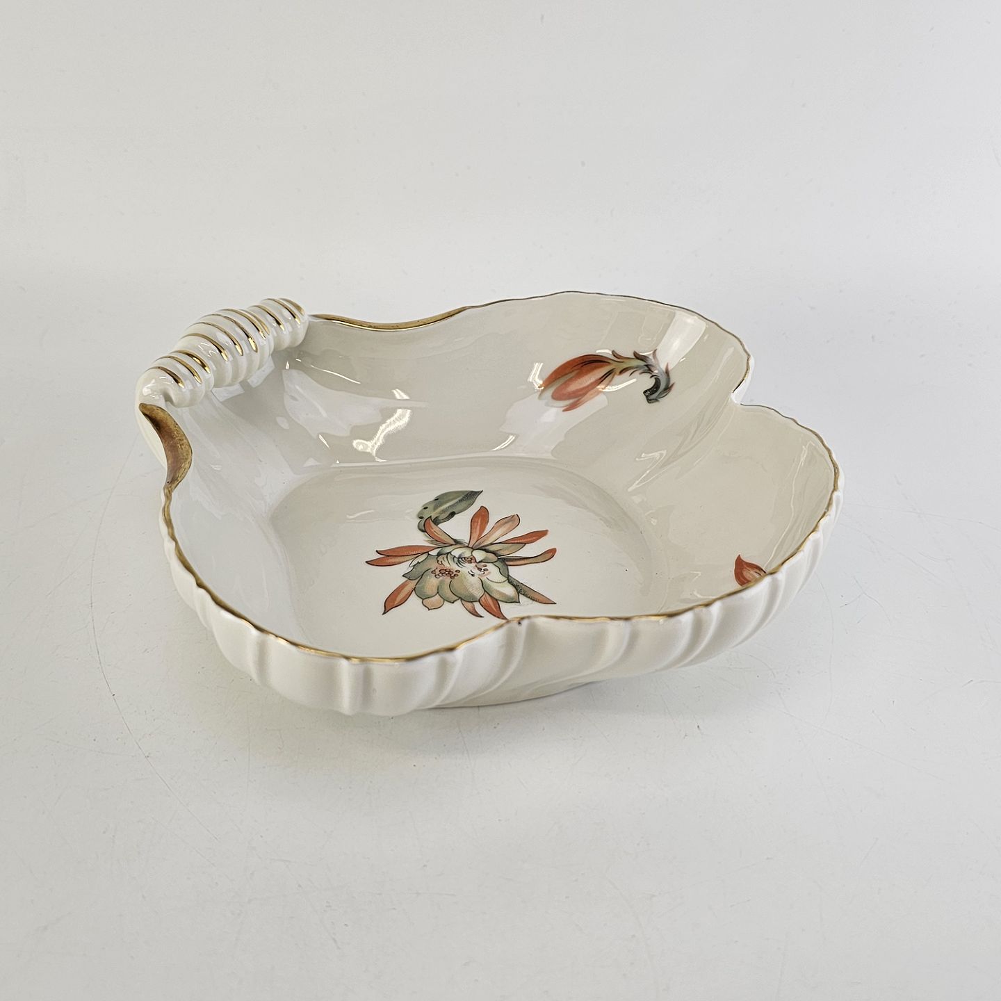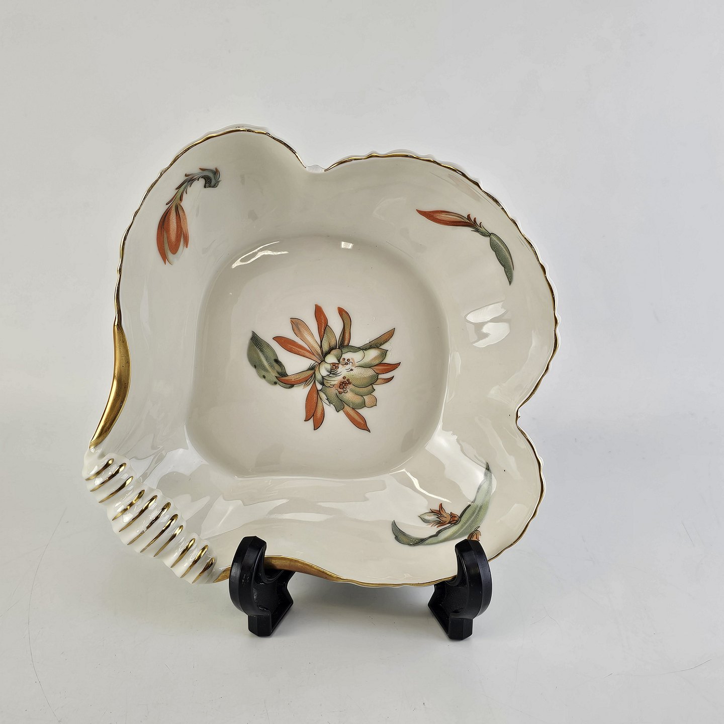 Kaktus er cremefarvet porcelæn i skælform, dekoreret med kaktusblomster og guldkant