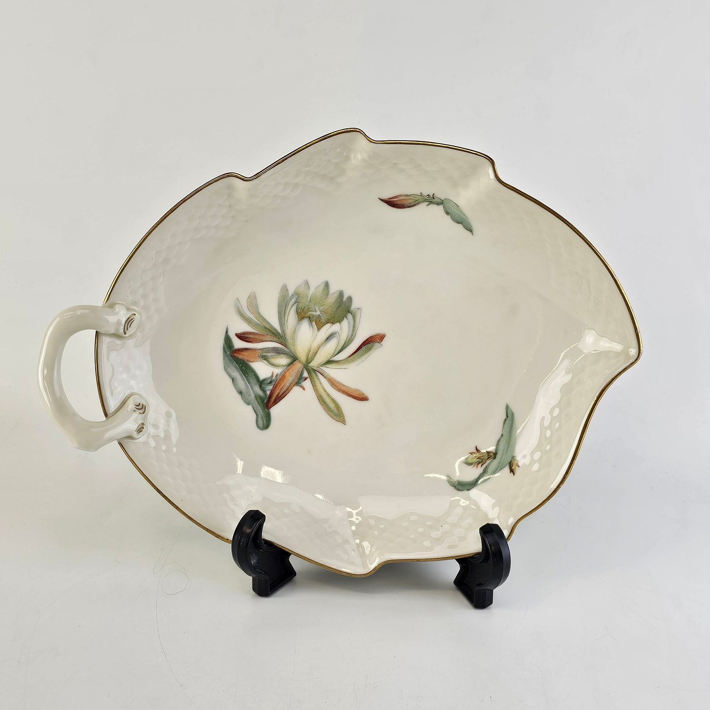 Kaktus er cremefarvet porcelæn i skælform, dekoreret med kaktusblomster og guldkant