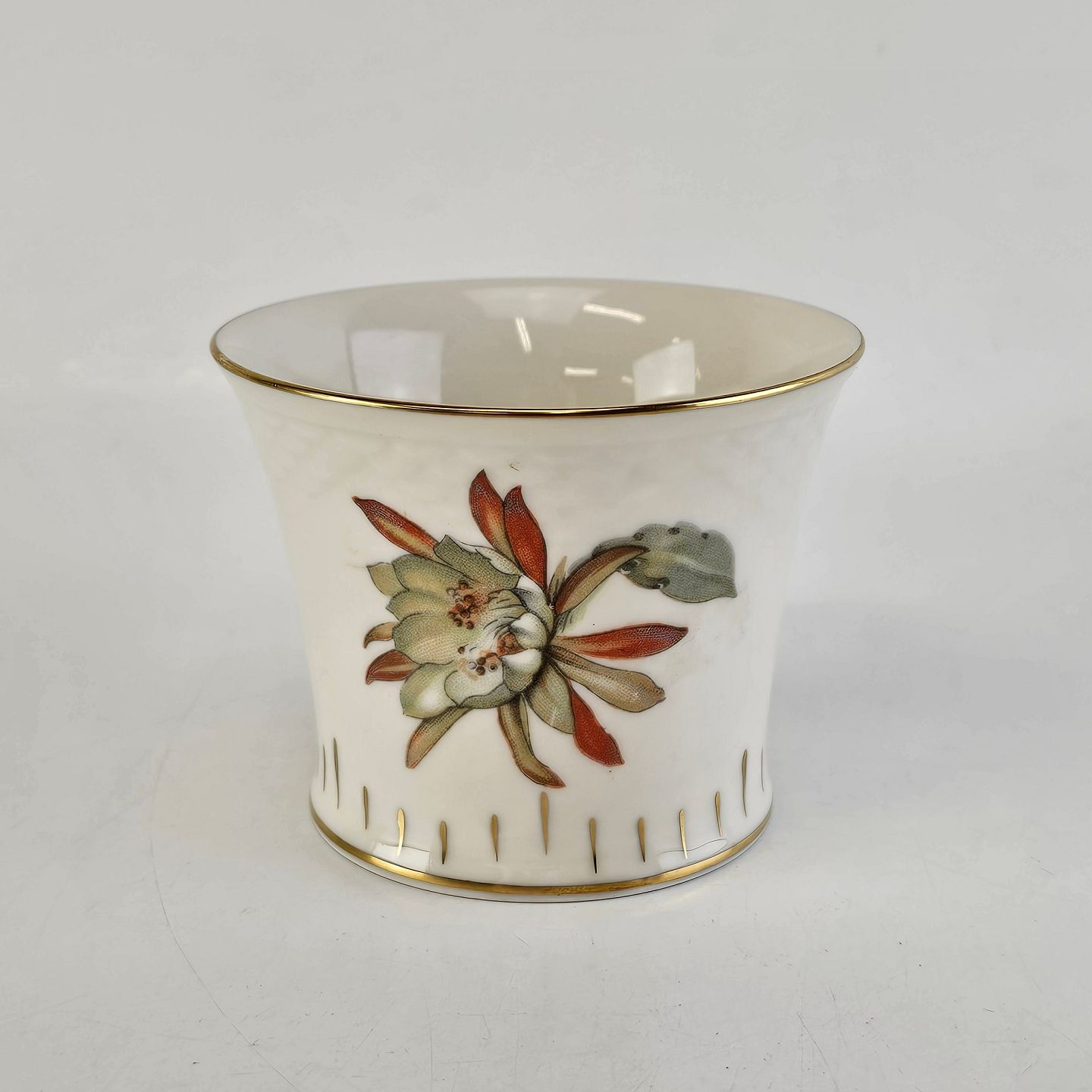 Kaktus er cremefarvet porcelæn i skælform, dekoreret med kaktusblomster og guldkant