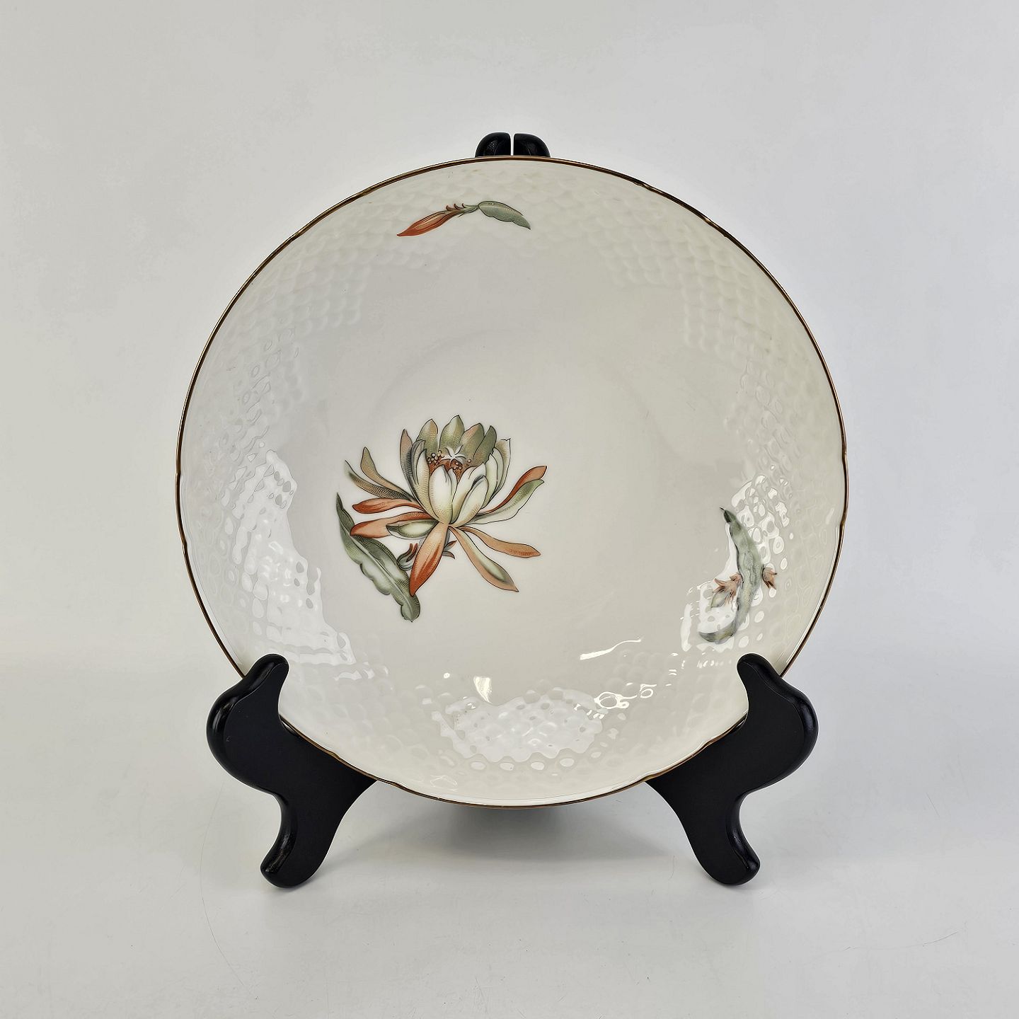 Kaktus er cremefarvet porcelæn i skælform, dekoreret med kaktusblomster og guldkant