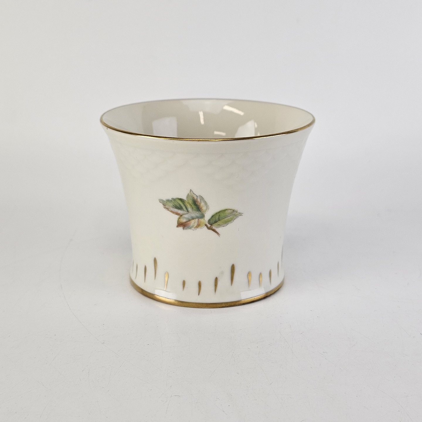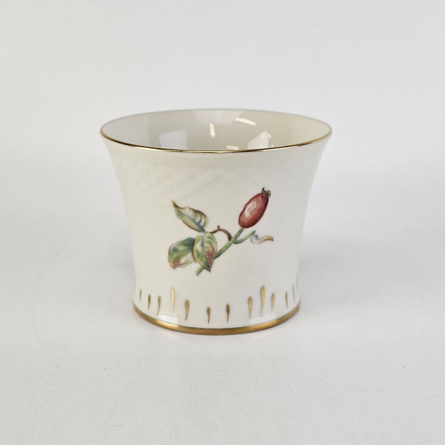 Balder er cremefarvet porcelæn i skælform, dekoreret med hyben og guldkant.