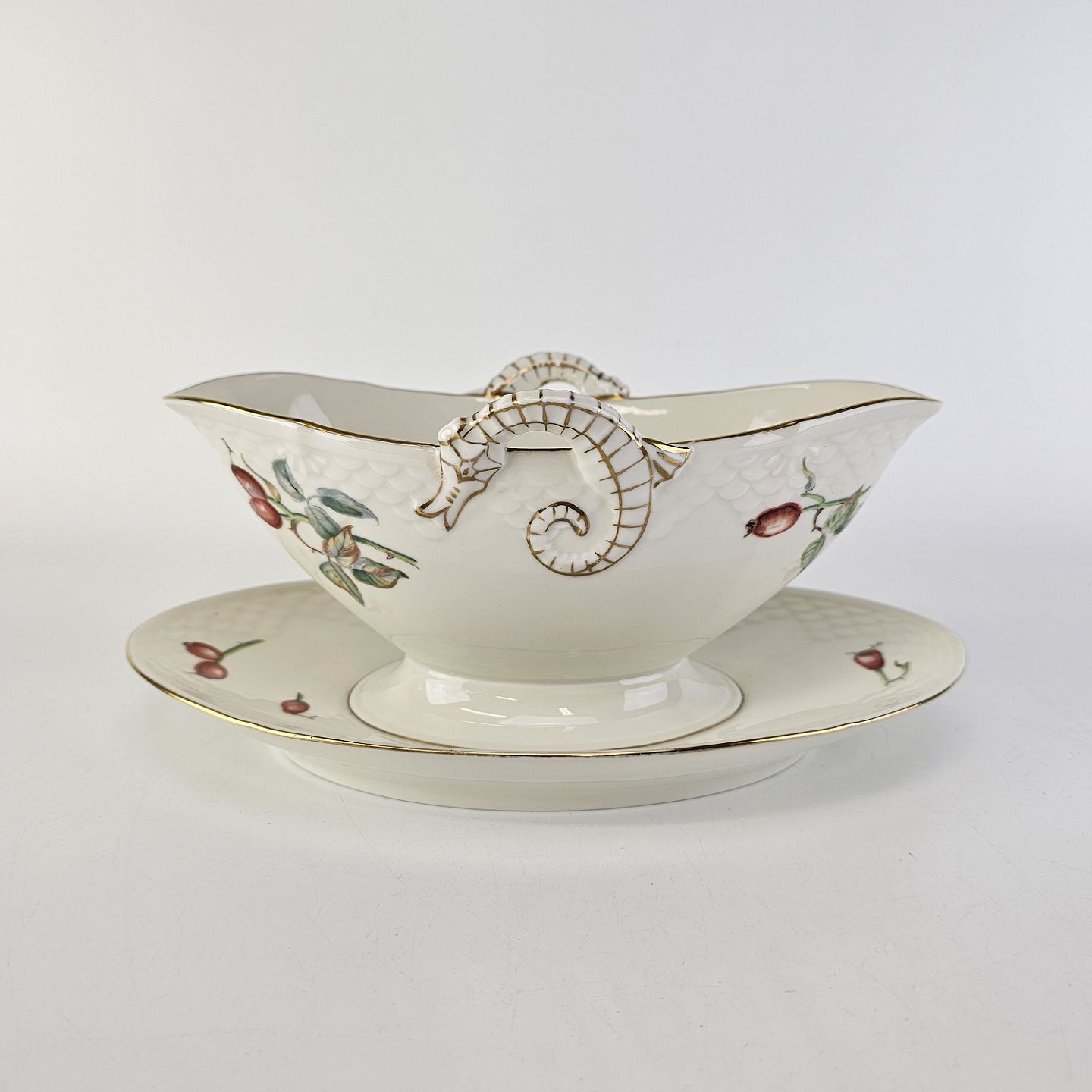 Balder er cremefarvet porcelæn i skælform, dekoreret med hyben og guldkant.