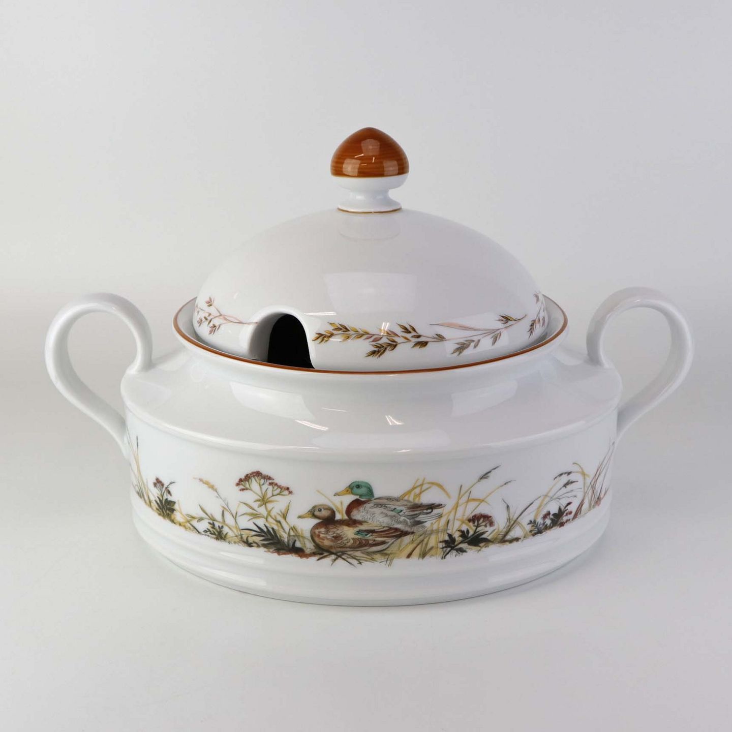 Ragout fad i porcelæn med låg og hanke, som er dekoreret med motiv af ænder fra stellet Jagtstel.