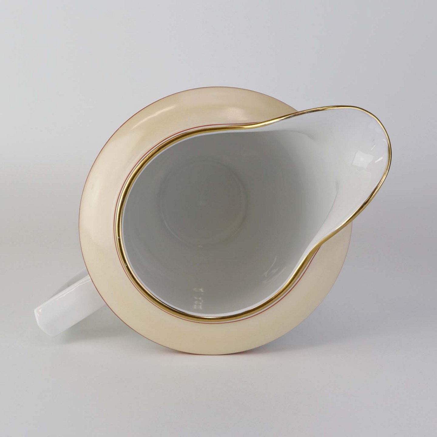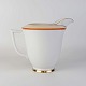 Service i glat hvidt porcelæn pyntet med dekoration i beige, brændt orange og gylden streg.