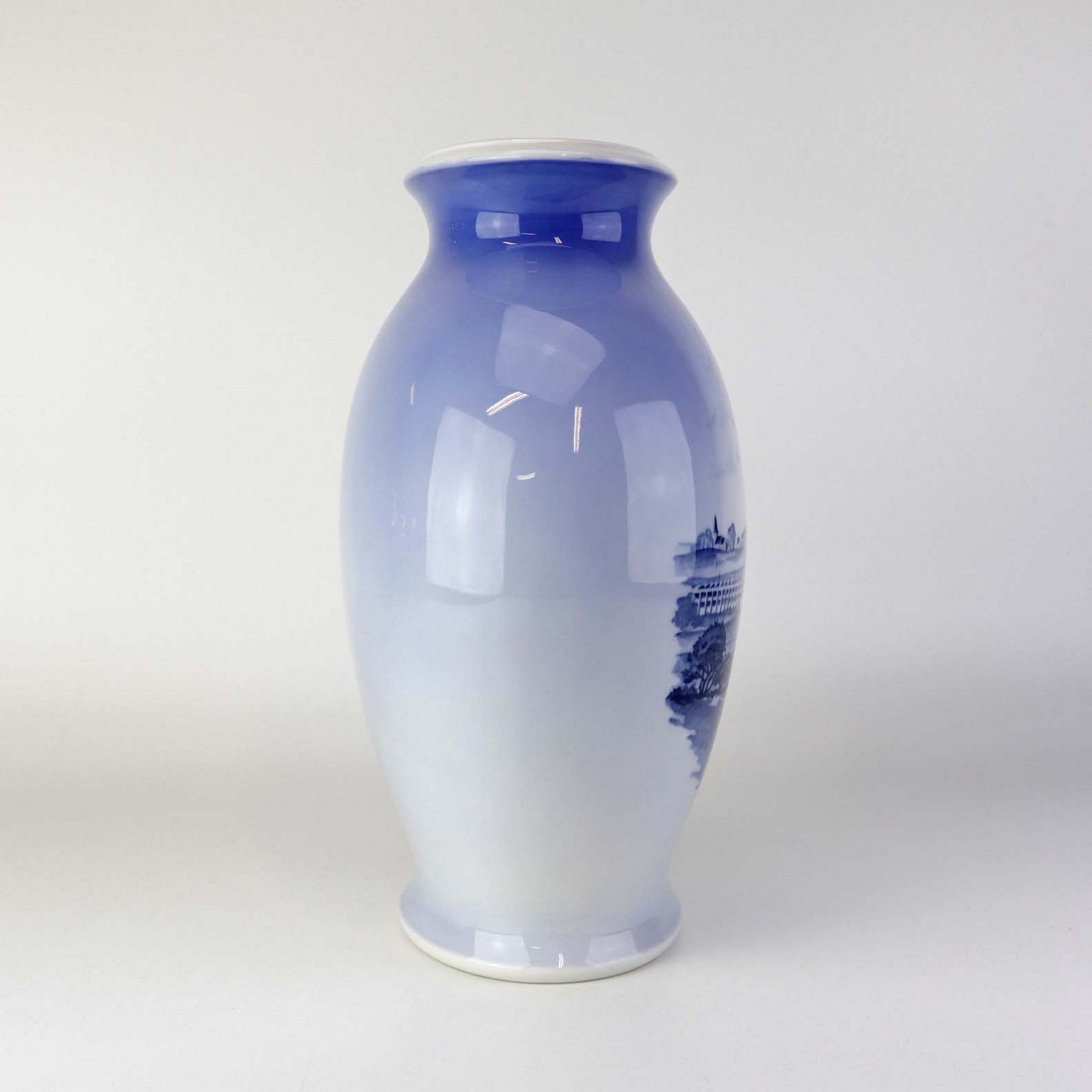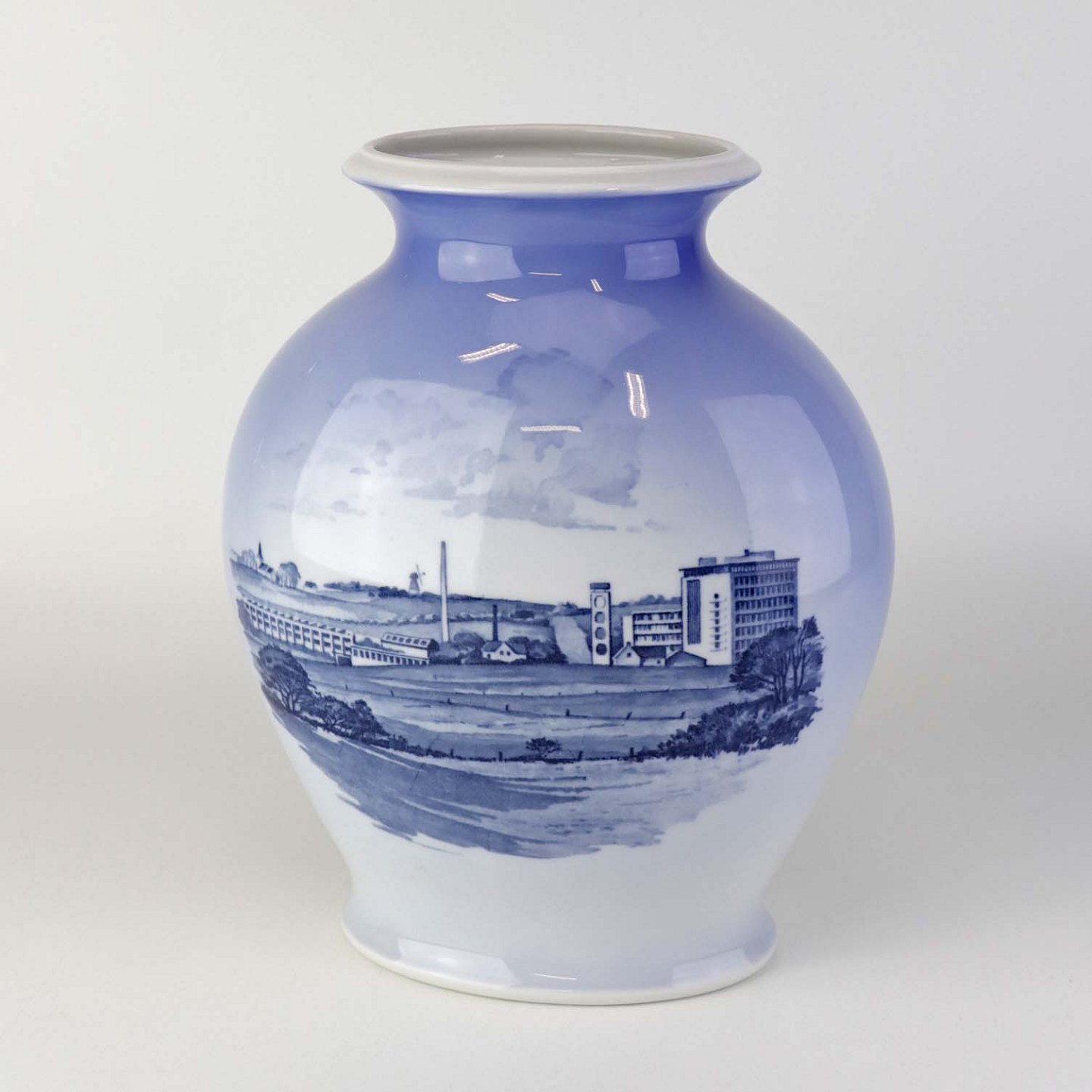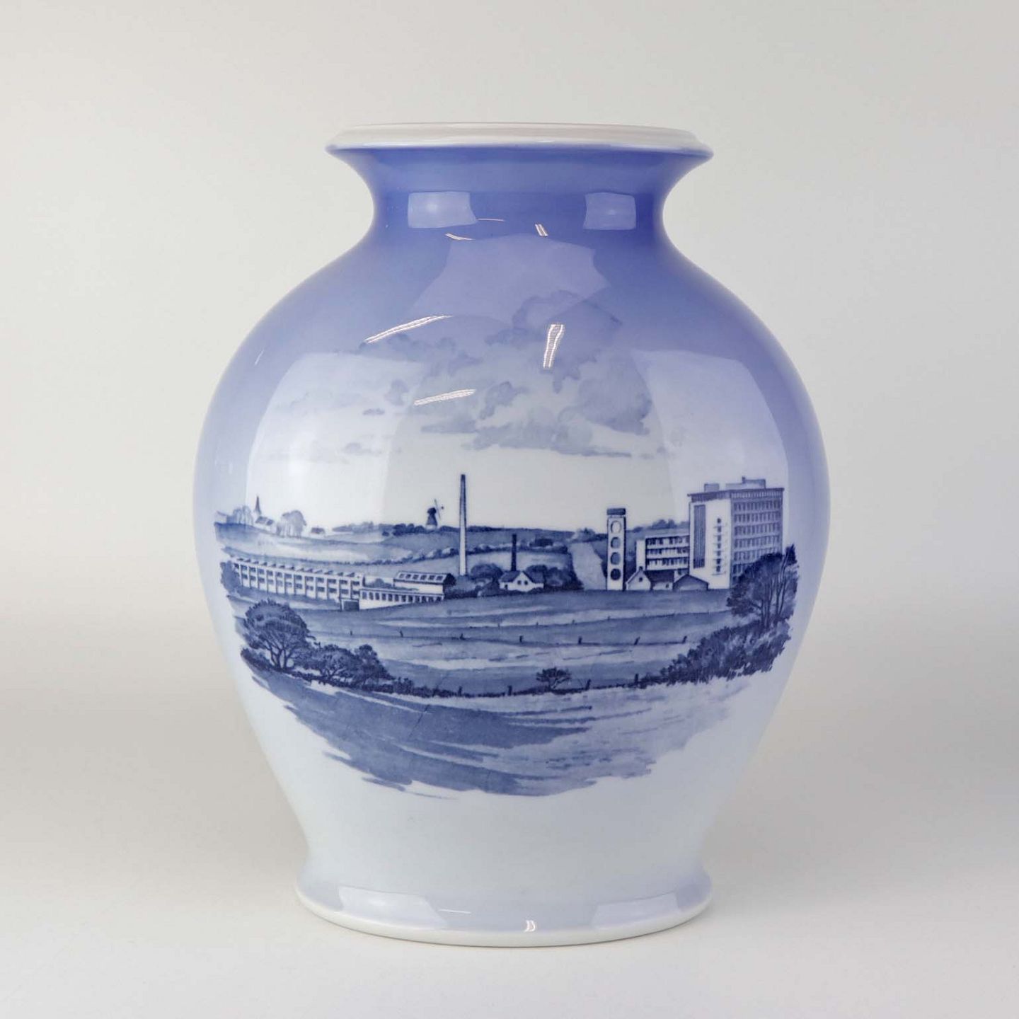 Oval jubilæumsvase i kongelig porcelæn med motiv af Danfoss fabriksbygninger. Nr. 3088