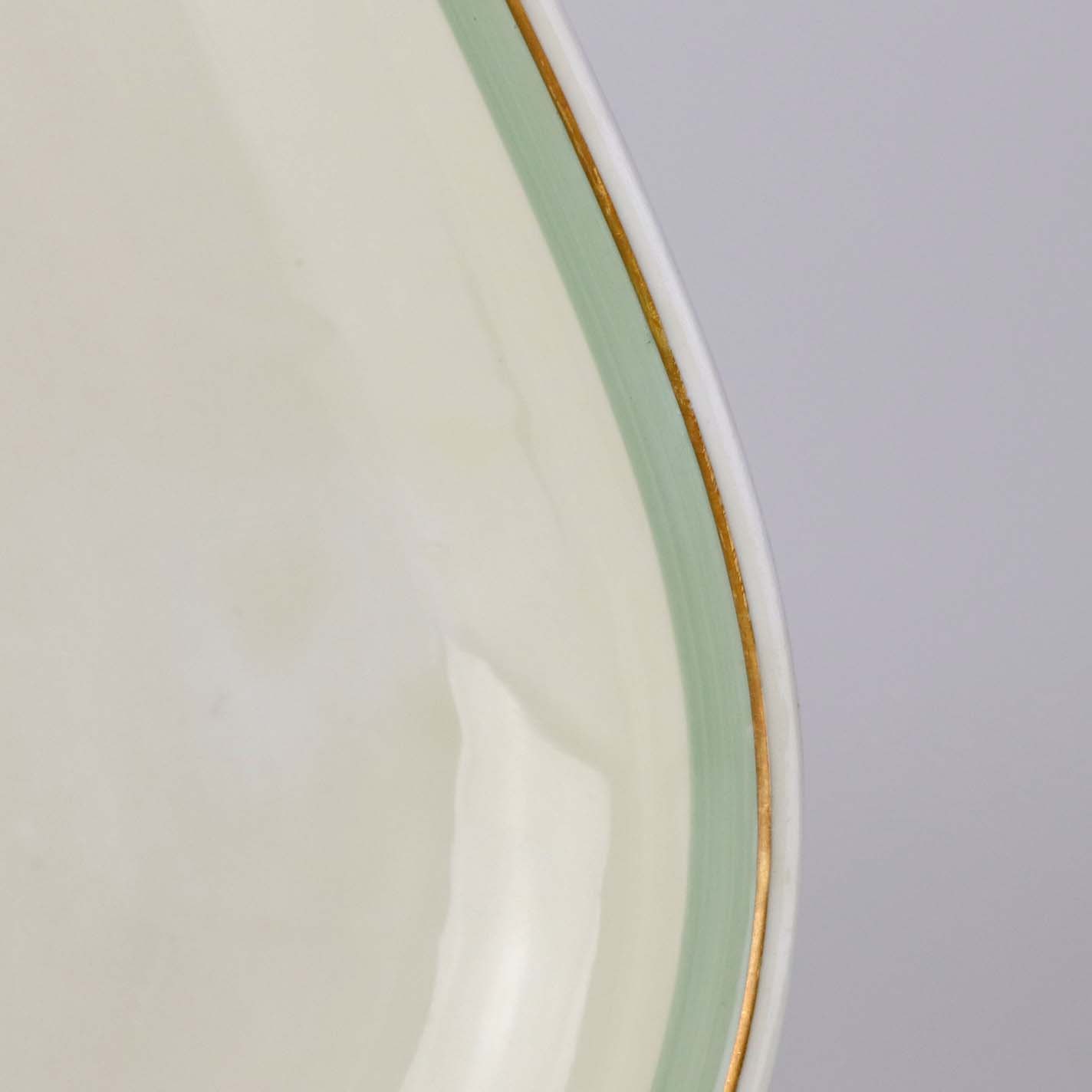 Stel i glat råhvidt porcelæn dekoreret med lysegrøn stribe og guldkant samt motiv af hjertegræs.