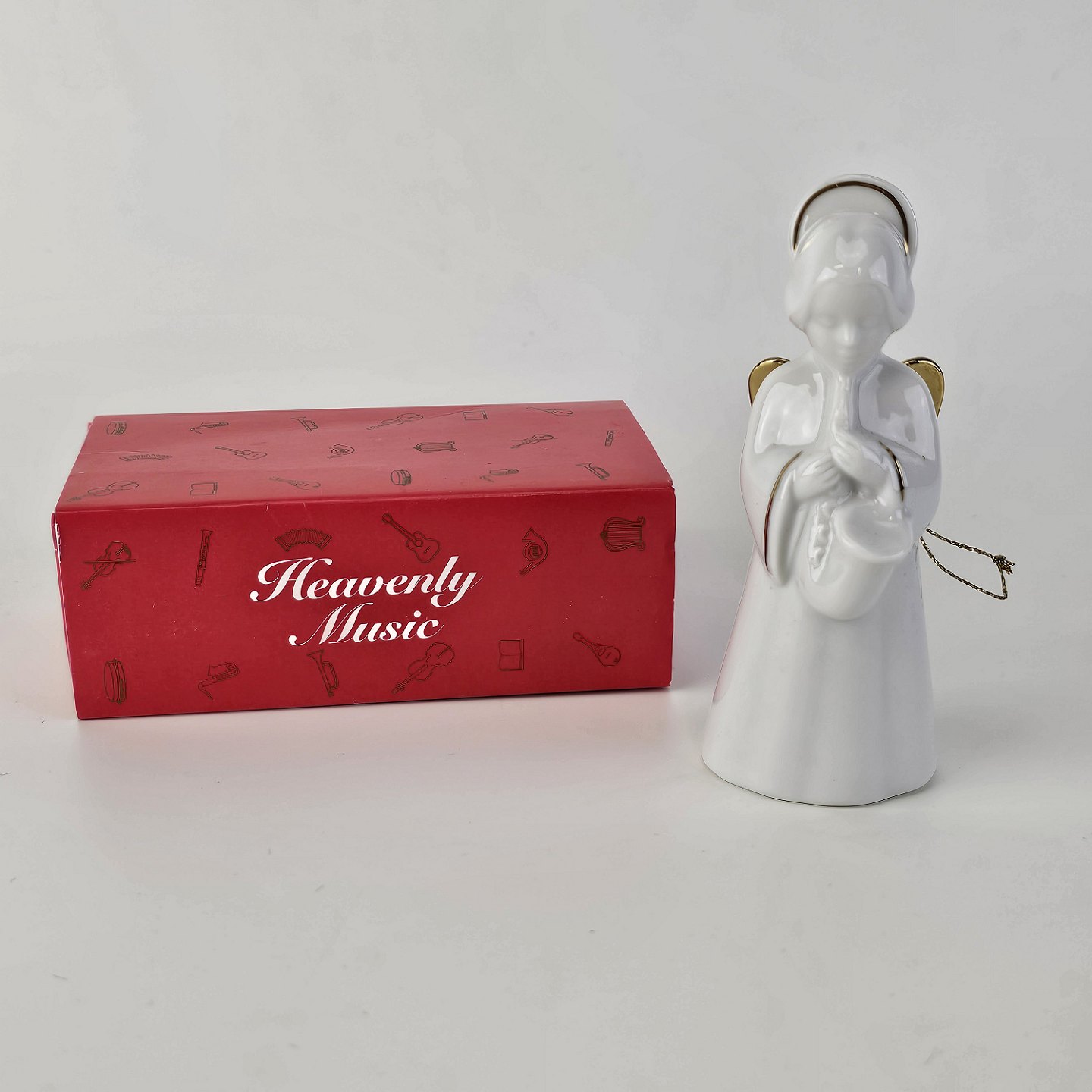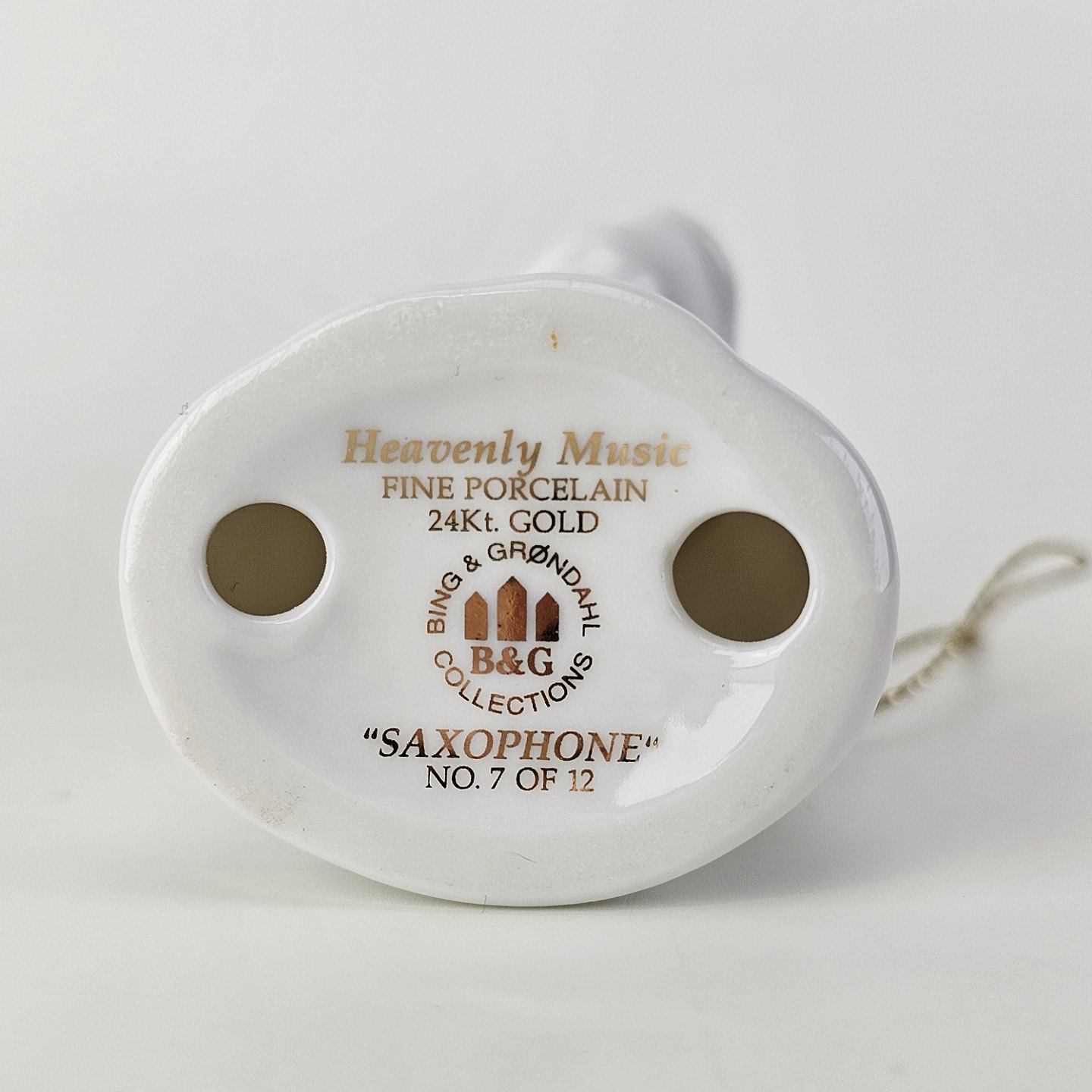 Figur med motiv af en engel som spiller på saxofon. Figuren er i hvidt porcelæn med forgyldte vinger og detaljer i 24 karat guld.
