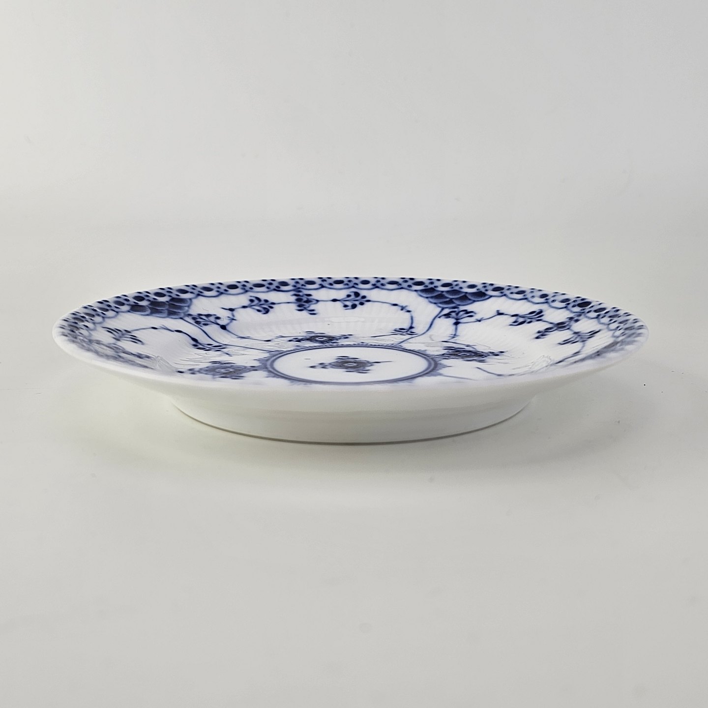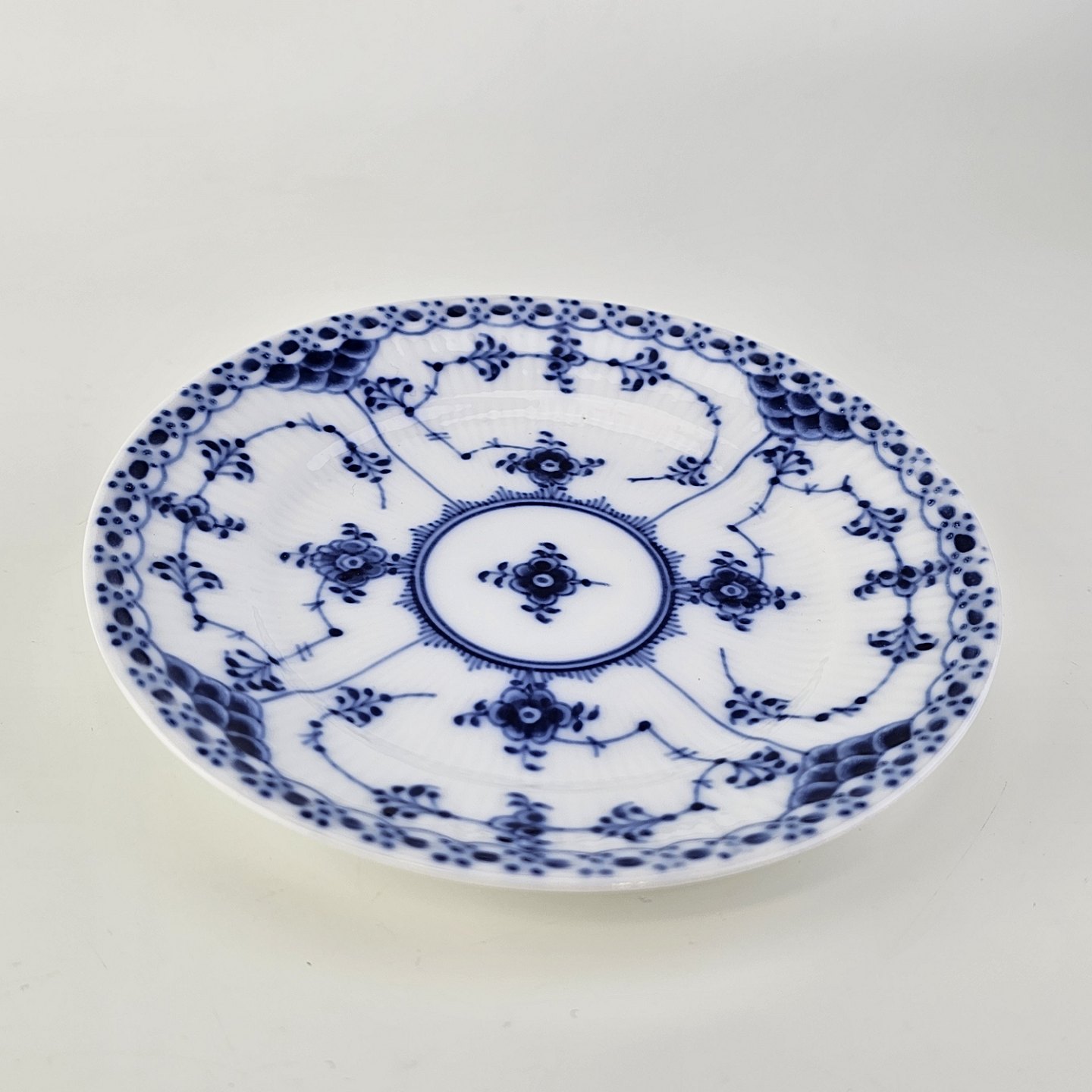 Musselmalet halvblonde er riflet hvidt porcelæn med dekoration af blå ranker og en kant med blonder.