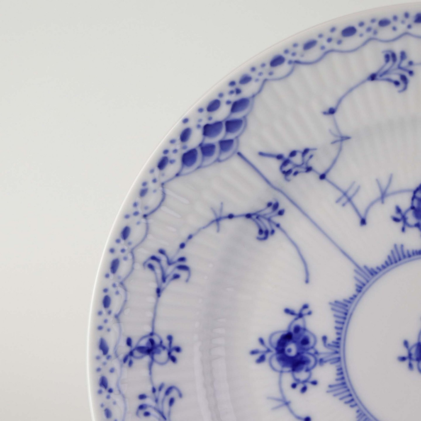 Musselmalet halvblonde er riflet hvidt porcelæn med dekoration af blå ranker og en kant med blonder.