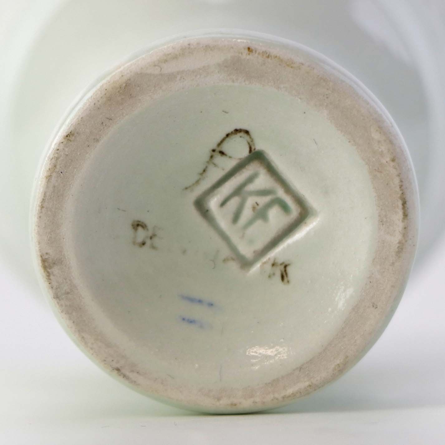 Fremstår med mørkning på glasuren, krakkeleringer i glasuren samt mindre fejl støbningen ved toppen.