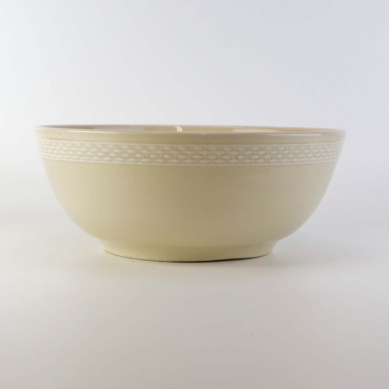 Sandfarvet fajancestel i stelform Viktoria II - Fletværk med dekoration af hvidt flet på gullig baggrund.