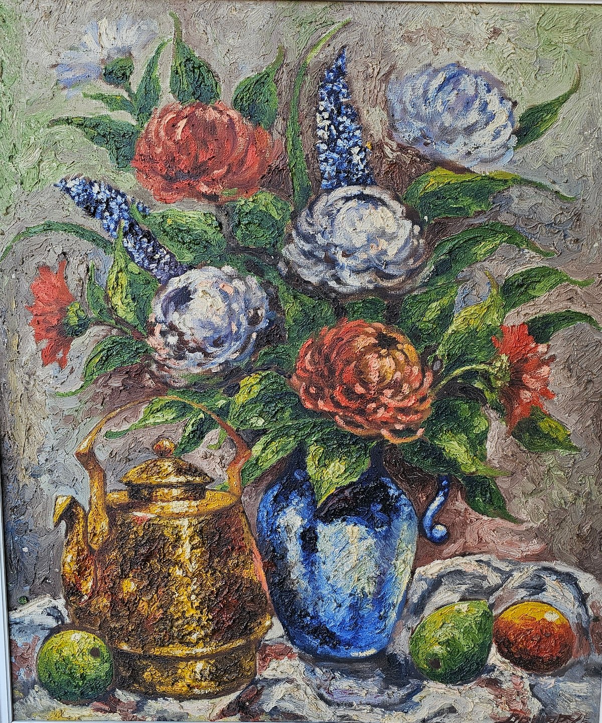 Oliemaleri på lærred monteret i hvid- og guldmalet ramme med motiv af en vase med blomster