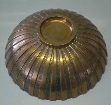Beskrivelse: SOLGT: Skål af bronce med kanelleret yderside. Stemplet Tinos, Ægte Bronce, Made in Denmark. H. 7,5. Diam. 22. Almindelig alders og brugsslitage Bronzeskål